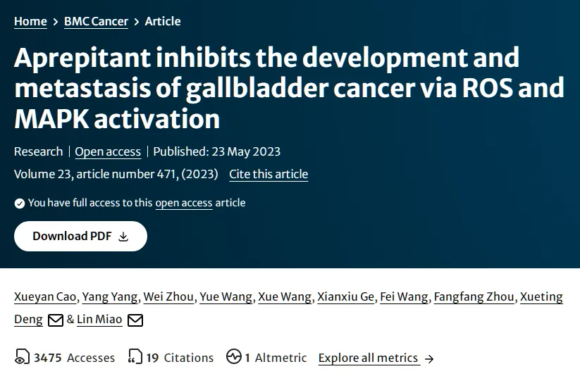 论文题为“Aprepitant inhibits the development and metastasis of gallbladder cancer via ROS and MAPK activation”(阿瑞吡坦通过ROS和MAPK激活抑制胆囊癌的发展和转移)