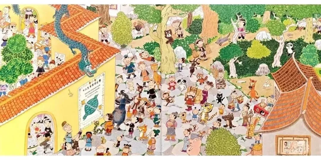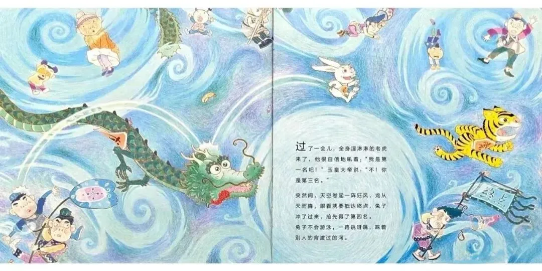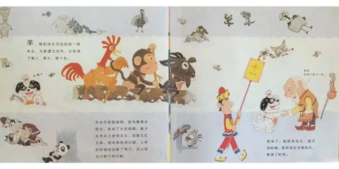 突然间,天空卷起一阵狂风,龙从天而降,眼看着就要抵达终点,兔子冲了过去,抢先得了第四名。兔子不会游泳,一路跳一跳,踩着别人的背渡河。