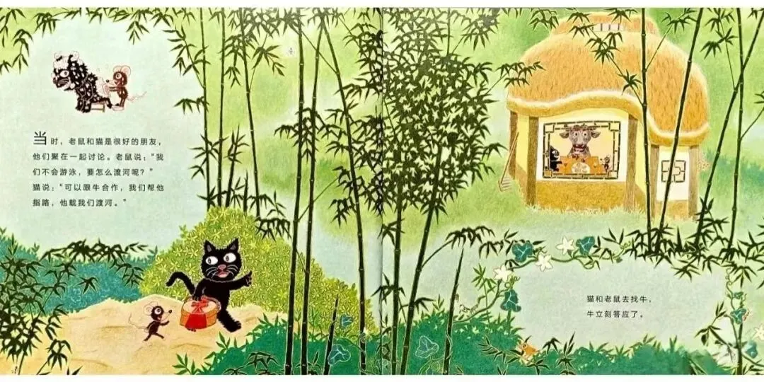 当时,老鼠和猫是很好的朋友,他们聚在一起讨论。老鼠说:“我们不会游泳,要怎么渡河呢?”猫说:“可以跟牛合作,我们帮他指路,他载我们渡河。”猫和老鼠去找牛,牛立刻答应了。