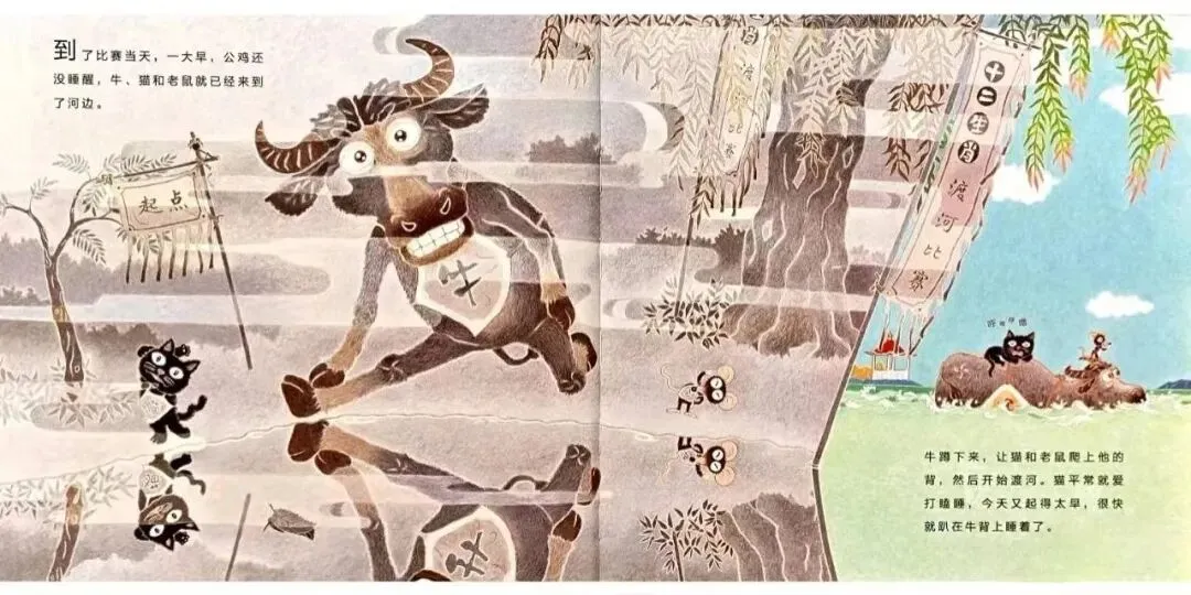 到了比赛当天。一大清早,公鸡都还没睡醒,牛、猫和老鼠来到河边。牛蹲下来,让猫和老鼠爬上他的背,然后开始渡河。猫平常就爱打瞌睡,今天又太早起来,很快就趴在牛背上睡着了。