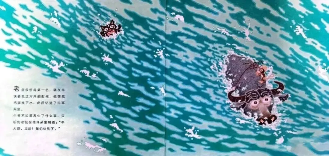 老鼠很想得第一名,就在牛快抵达河岸的时候,他突然把猫推落水,然后钻进牛耳朵里。牛并不知道发生了什么事,只听到老鼠在他耳朵里喊着:“牛大哥,快!我们到了。”