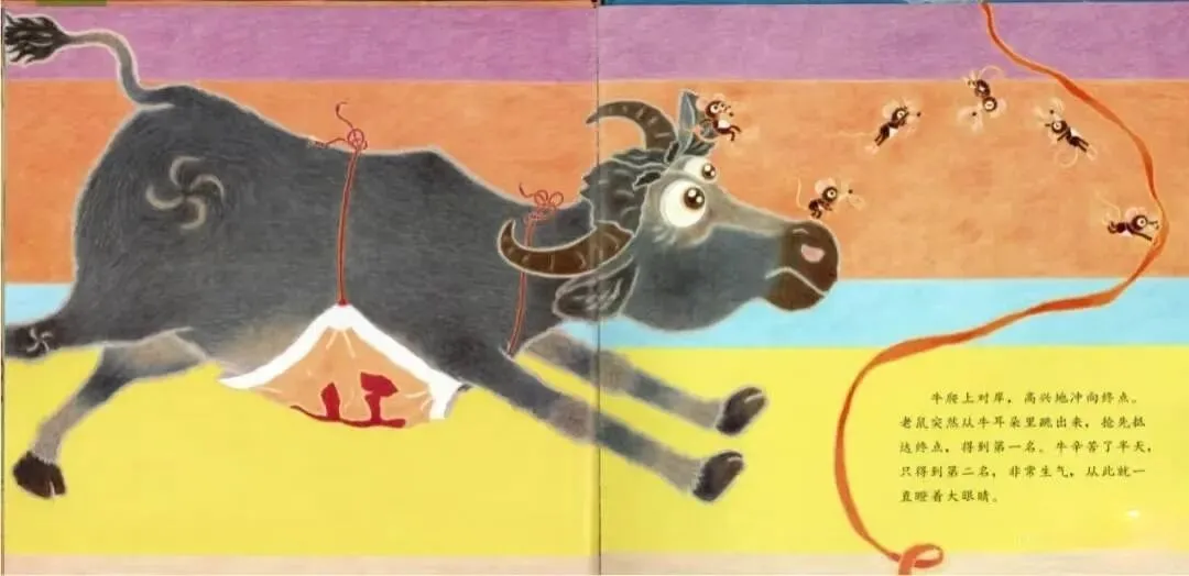 牛爬上对岸,高兴地冲向终点。老鼠突然从牛耳朵里跳出来,抢先抵达终点,得到第一名。牛辛苦了半天,只得到第二名,非常生气,从此就一直瞪大眼睛。