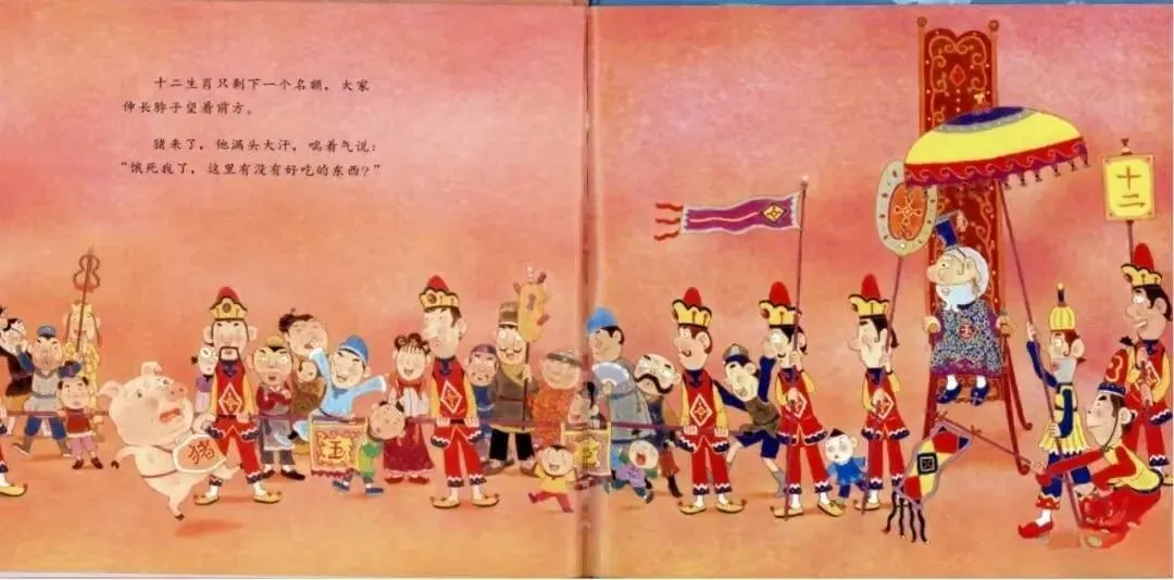 十二生肖只剩下一个名额,大家伸出脖子望着前方。猪来了,他满头大汗,喘着气说:“饿死我了,这里有没有好吃的东西?”