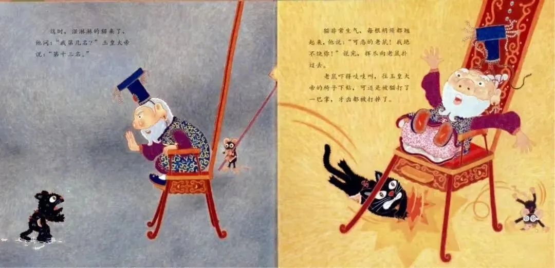 这时,湿淋淋的猫来了,他问:“我第几名?”玉皇大帝说:“第十三名。”猫非常生气,每根胡须都翘起来,他说:“可恶的老鼠!我绝不饶你!”说完,挥爪向老鼠扑过去。老鼠吓得吱吱叫,往玉皇大帝的椅子下钻,可还是被猫打了一巴掌,牙齿都被打掉了。