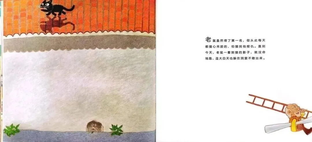 老鼠虽然得到了第一名,但从此每天提心吊胆,怕猫找他报仇,直到今天,老鼠看见猫的影子,就没命地跑,连大白天也躲在洞里不敢出来。