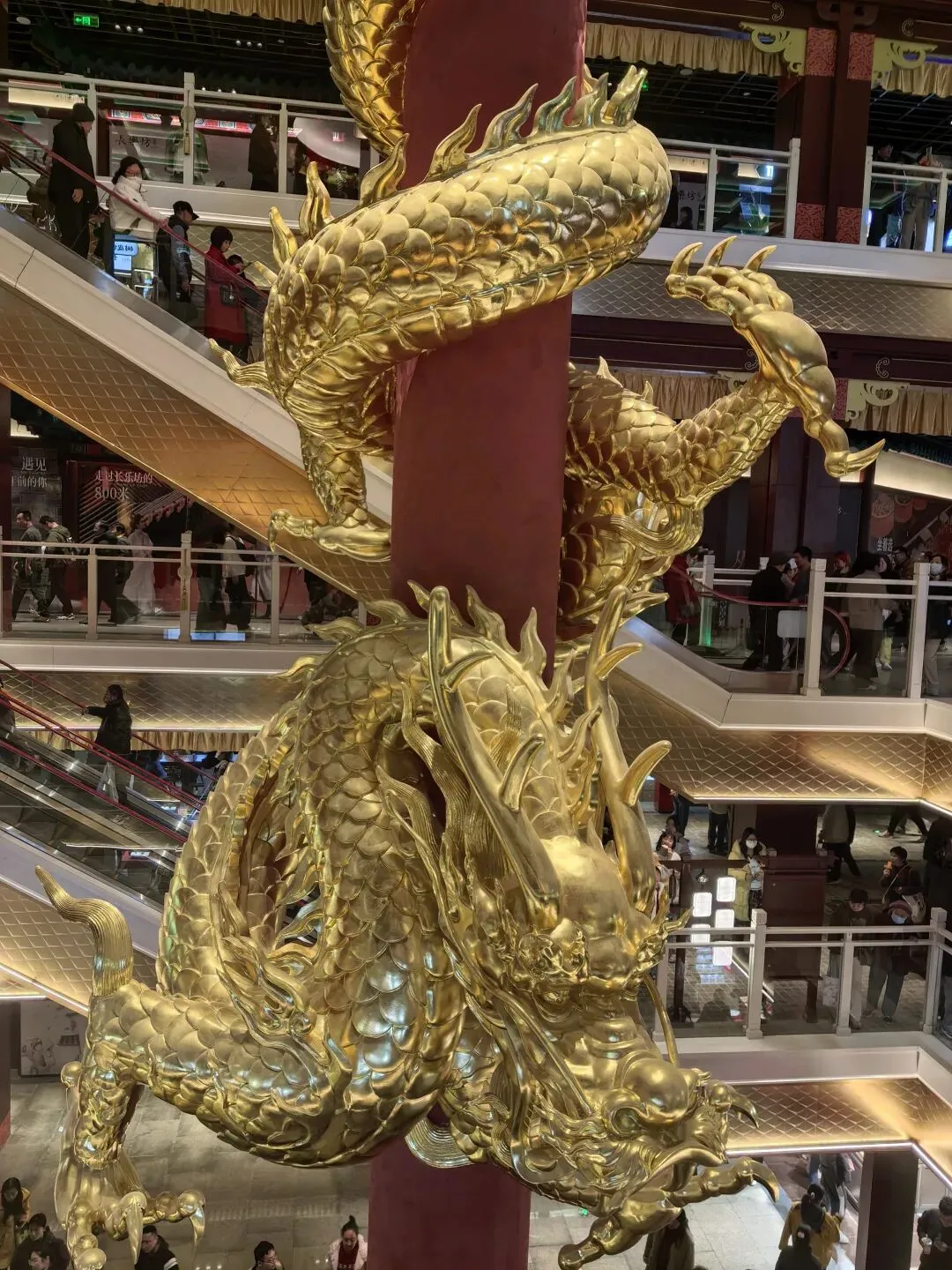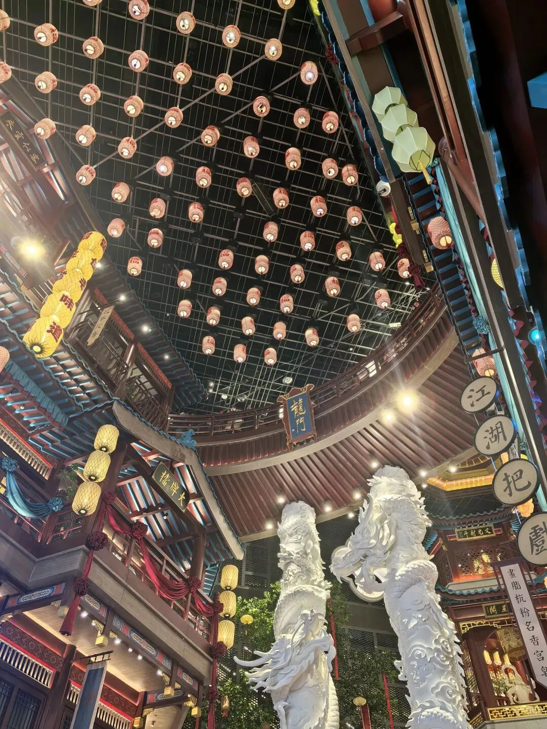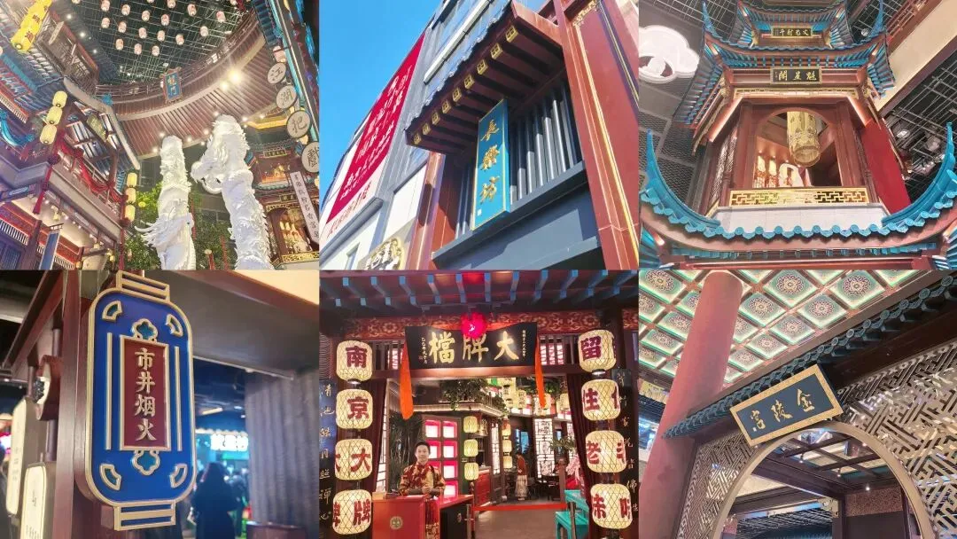 1️⃣800米吃遍逛遍南京城,600年赏尽品尽金陵韵。以“大明金陵繁会”为主题,匠心独运地构造空间,巧妙融合“金陵48景”元素,特别是挑高的大堂和中庭的金龙柱霸气十足,感觉到处都是精心打造视觉亮点