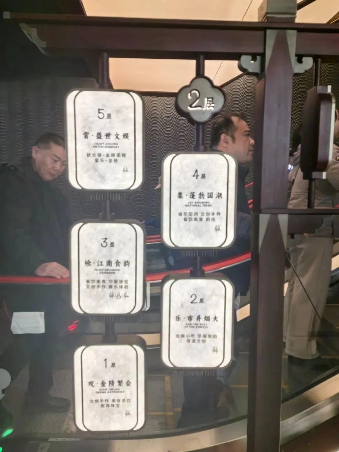 1️⃣是商场:分为五层,一层主题“观·金陵繁会”,以文创手作、美食茶饮、服饰珠宝为主,二层主题“乐·市井烟火”,以金陵小吃、华府旅拍、非遗文创为主,三层主题“飨·江南食韵”,以餐饮美食、华服旅拍、文创手作、娱乐体验为主,四层主题“集·蓬勃国潮”,以娱乐空间、文创手作、餐饮美食、剧场为主,五层主题“赏·盛世文娱”,以高端餐饮为主,目前有两家店铺,分别为状元镜·金陵茶楼、宴乐·金陵