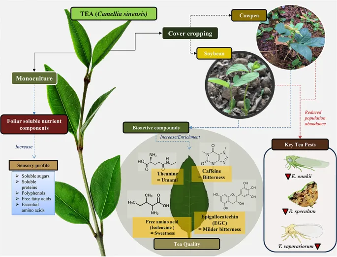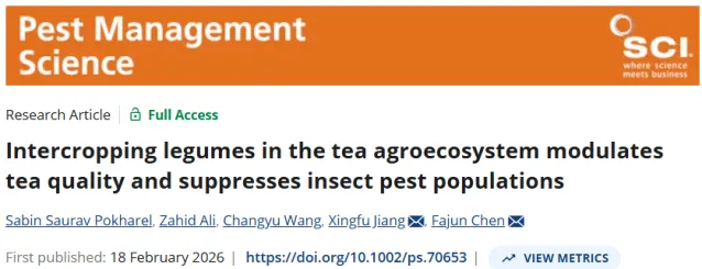2026年2月18日,南京农业大学植物保护学院陈法军教授联合中国农科院植物保护研究所江幸福研究员在昆虫学领域著名期刊《Pest Management Science》上发表了一篇题为”Intercropping legumes in the tea agroecosystem modulates tea quality and suppresses insect pest populations”的研究论文(https://doi.org/10.1002/ps.70653),旨在为制定生态韧性高且经济可行的茶树可持续管理和生态控害及其生产实践提供帮助。