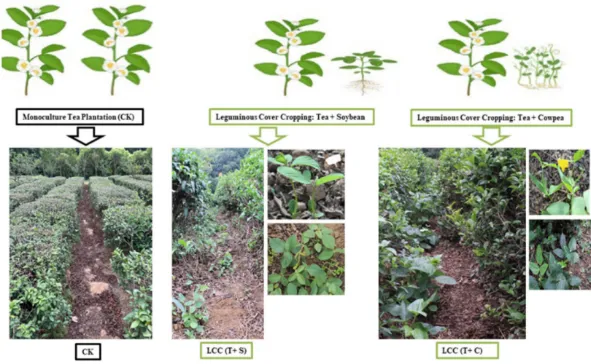 Fig.1Field layout model of the leguminous cover cropping (LCC) with soybean (S) and cowpea (C) in tea plantation rows. LCC, leguminous covercropping; LCC-S, LCC with soybean; LCC-C, LCC with cowpea; CK, control as the monoculture cropping (MCC)