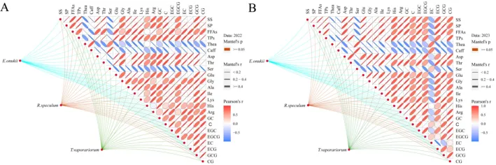 Fig.2 Correlation heat map illustrating the population abundances of three major tea insect pests and the foliar concentrations of tea quality parameters in tea plantations in 2022 (A) and 2023 (B). In the correlation heat maps, red color indicates a positive correlation and blue indicates a negative correlation; the intensity of the color represents the degree of correlation.