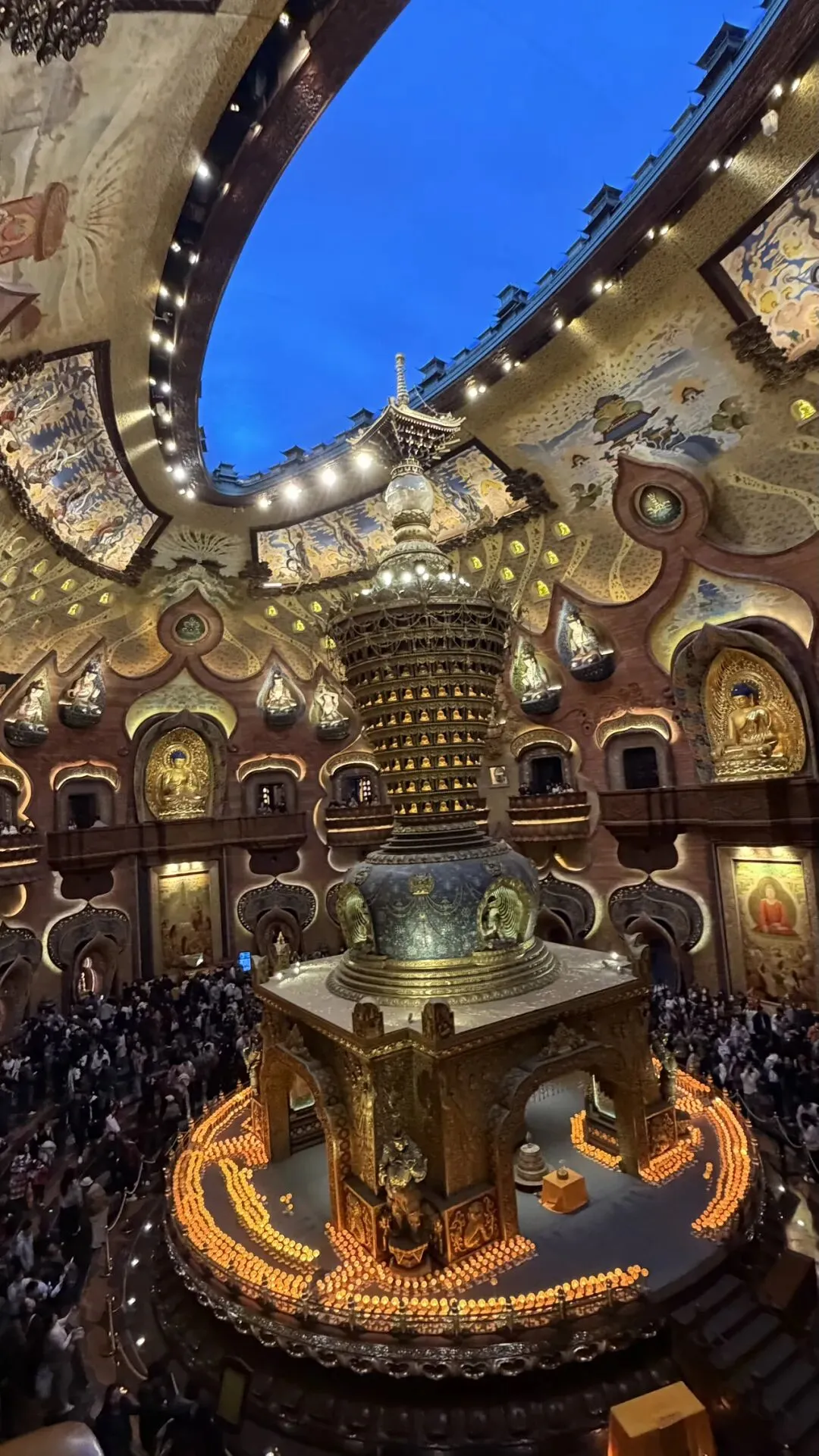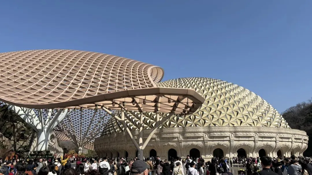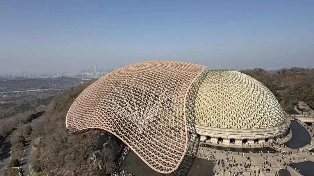 佛顶宫尤其令人震撼,大穹顶如袈裟覆山,小穹顶为莲花托宝;地下藏宫恒温恒湿,千佛殿气势恢宏。原矿坑被巧妙改造为佛顶宫,“莲花托珍宝”的建筑与自然山体融为一体,实现了工业遗迹与自然生态的完美修复。