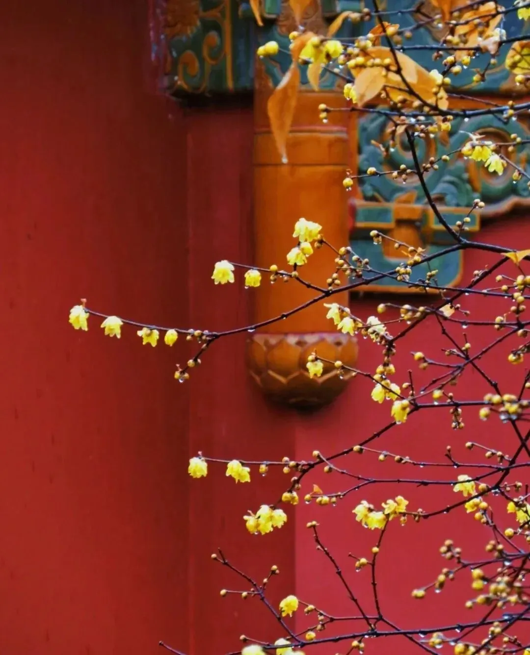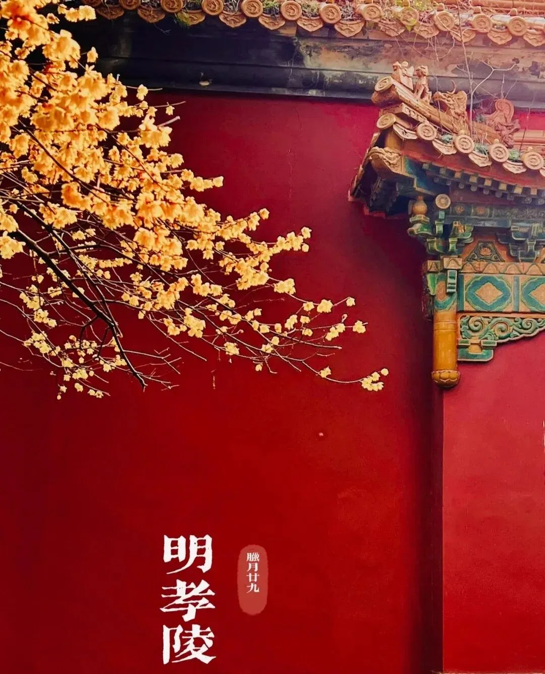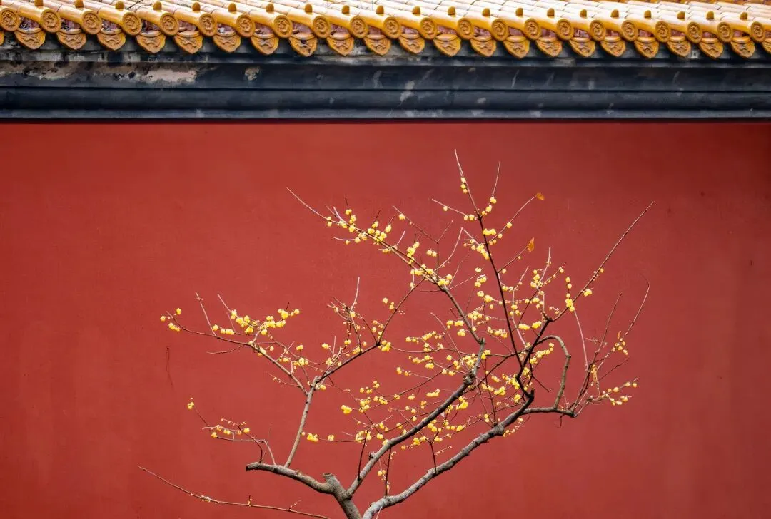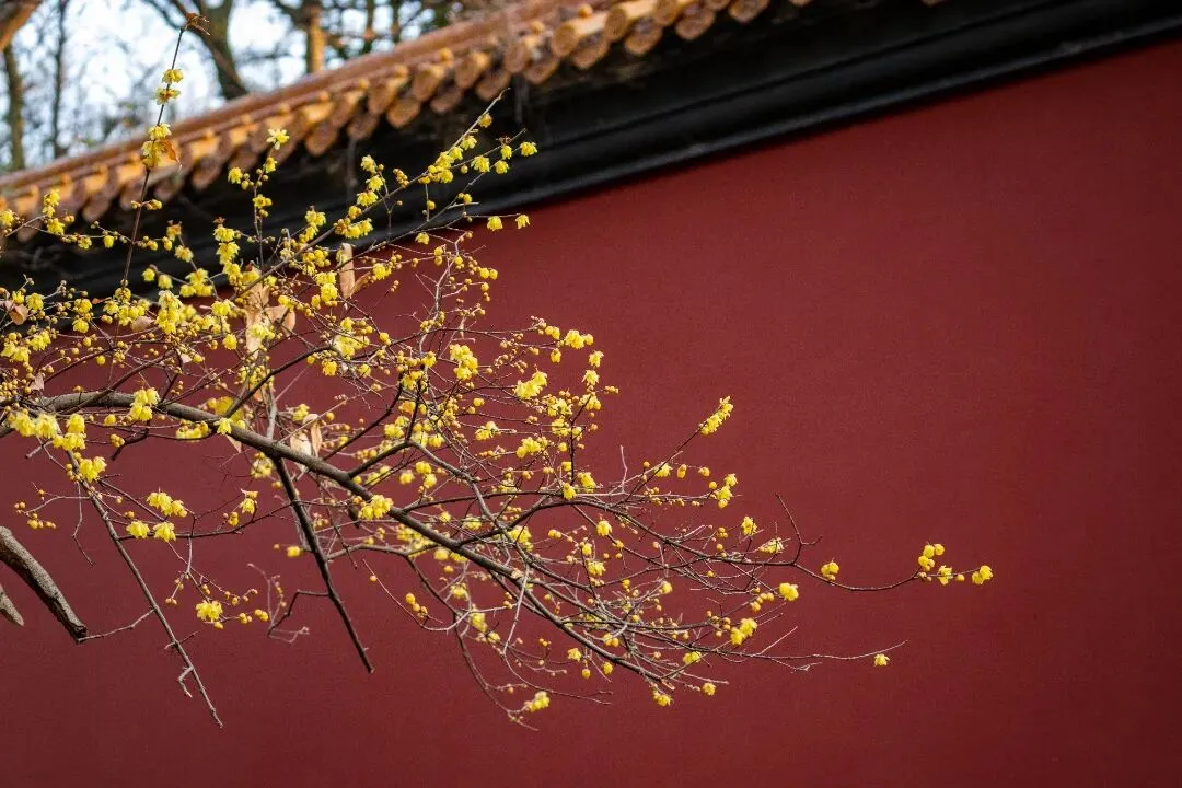 “红墙腊梅探出头,深院已知报春来”,斜阳打在墙头,几枝腊梅像是发夹一样,别在红墙金瓦的肩头,这番绝美景象在明孝陵演绎得淋漓尽致。