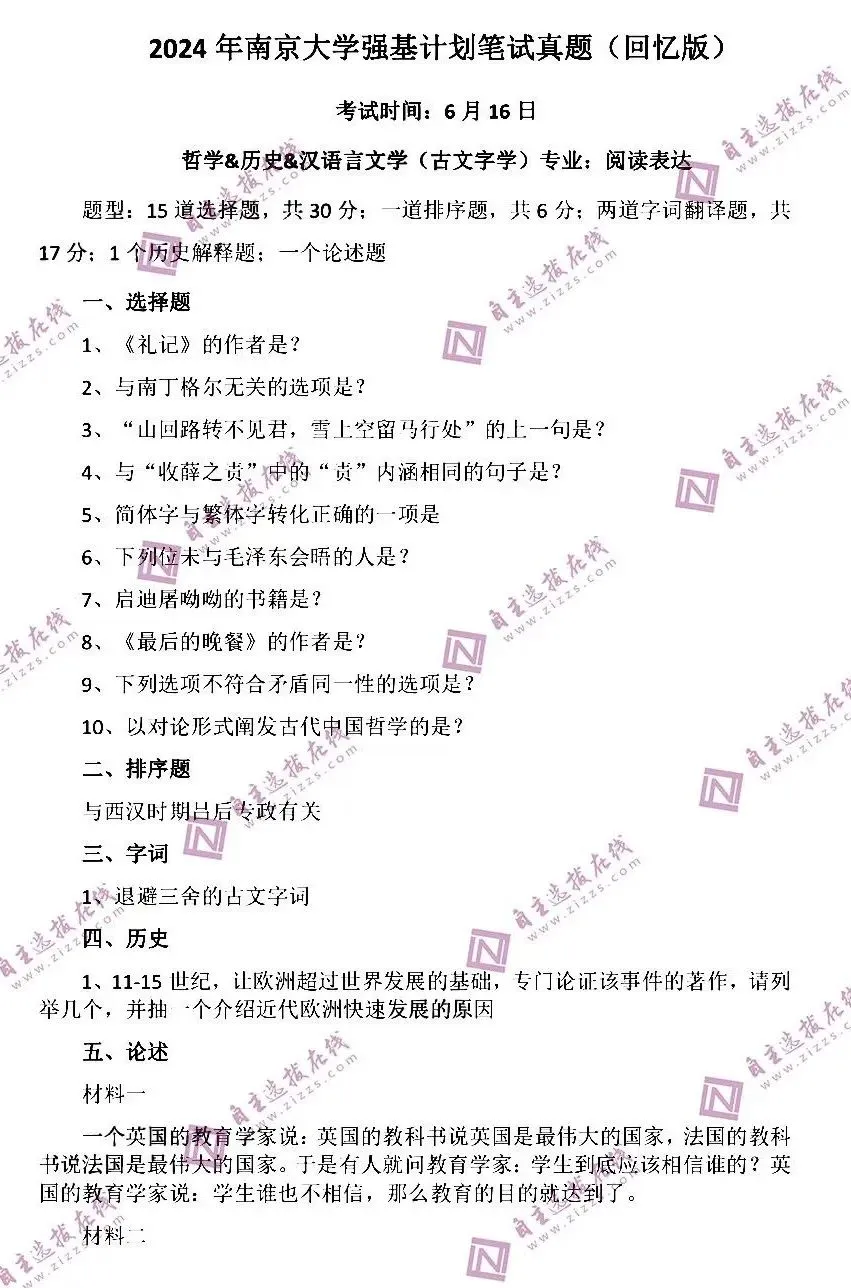 👉题型&题量:文史哲综合15道单选,单选题每道题6个选项,4道主观题,每题2问。