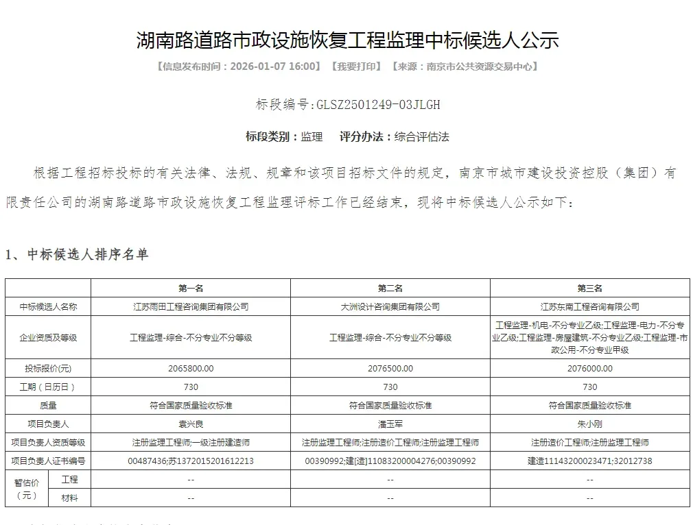 近日,官方发布了湖南路道路市政设施恢复工程监理中标结果,江苏雨田工程咨询集团有限公司中标人,这也意味着,为期2年的湖南路改造,即将拉开帷幕