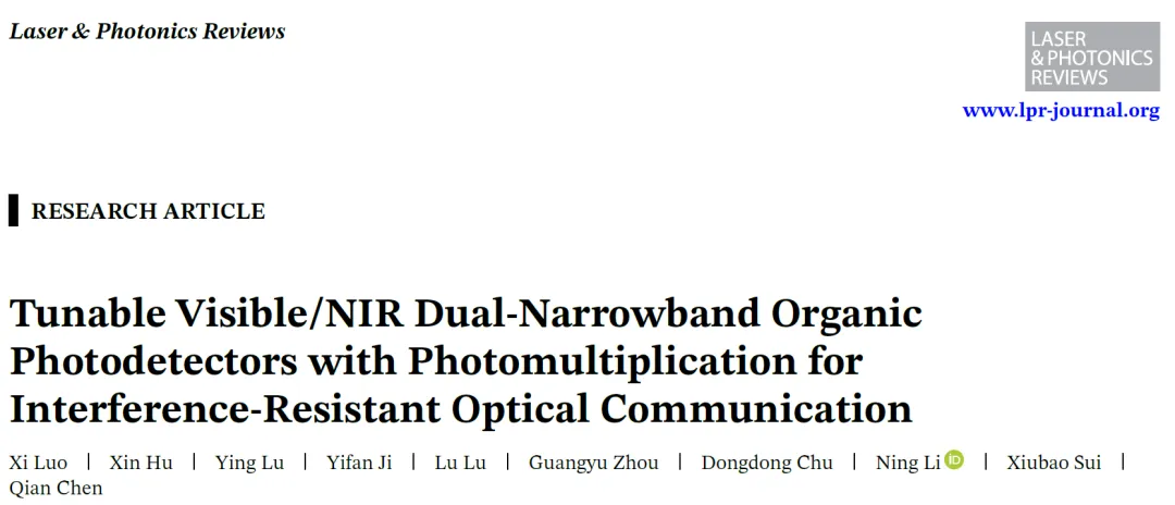 『能源光电子』LPR 教育部长江学者南京理工大学隋修宝教授/海外优青李宁教授:从宽带到精准:单器件实现可见—近红外双窄带高增益探测
