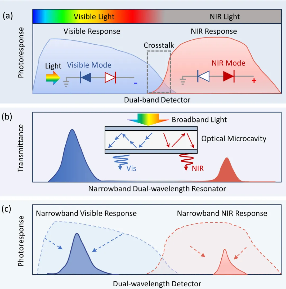 图 1 | 使用光学微腔实现双窄带光谱响应的原理示意图。(a) 传统可见光/近红外双波段光电探测器的光谱响应和工作模式。(b) 光学微腔的示意结构及其相应的传输光谱。(c) 与光学微腔耦合后双波段光电探测器的光谱响应。