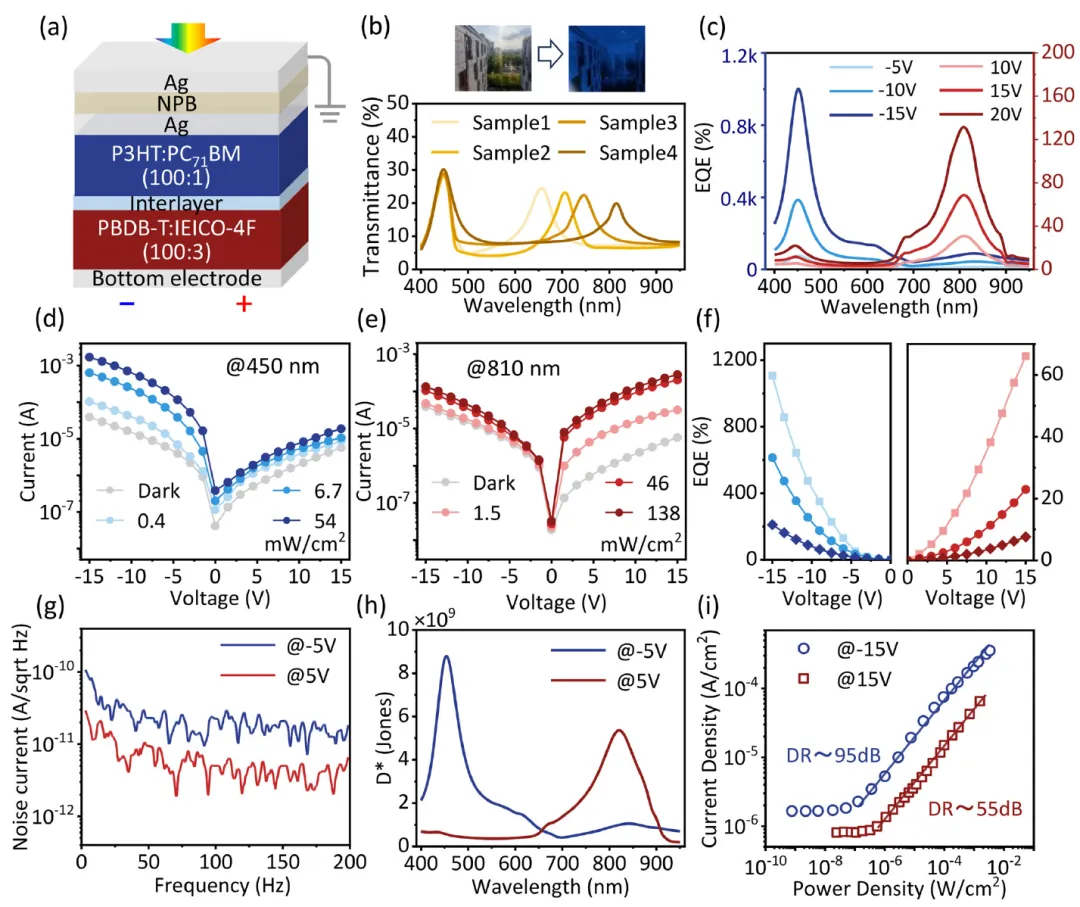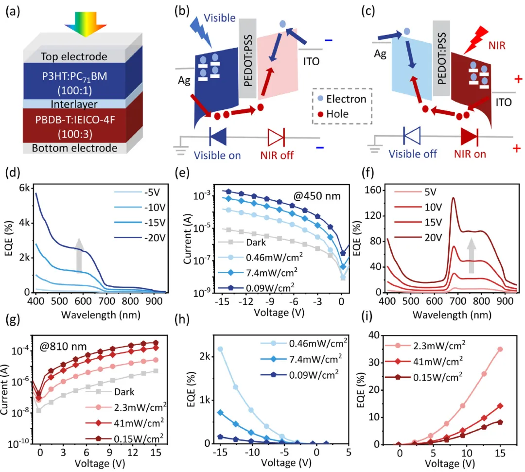 图 2d,e 分别展示了探测器在可见光模式下运行的外量子效率(EQE)和电流-电压(I-V)特性。随着偏压的增加,器件的 EQE 相应升高。在 -20 V 偏压下,峰值 EQE 达到近 6000%,远超 100% 的理论极限。这种显著的光倍增现象明确证实了可见光模式下内部载流子增益机制的存在。如图 2e 所示,光电流随入射光强度的增加而增大。在 450 纳米光照(0.09 W/cm²)和 -15 V 偏压下,光电流比暗电流大两个数量级以上。图 2f,g 展示了探测器在近红外模式下的 EQE 和 I-V 特性。虽然器件主要在近红外波段运行,但在 400-500 纳米范围内仍存在残余光响应,表明两种工作模式之间存在光学串扰。这源于材料特性以及可见光本体异质结对可见光子的吸收不完全。进一步增加本体异质结厚度可以部分抑制可见光范围的响应,但过度增厚会损害其近红外响应。在 20 V 偏压下,设计的器件在近红外区域实现了超过 100% 的 EQE。810 纳米照射下的光响应随偏压增加而增强,尽管其整体水平仍低于可见光模式。