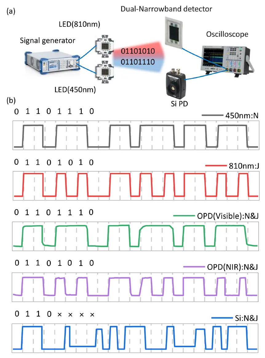 双窄带光电探测器由于其双波段探测能力和快速响应特性,在抗干扰光通信中展现出显著优势,使其特别适用于多输入环境中目标信号的精确识别。如图 4a 所示,本研究构建了一个双波段光电信号探测系统。该系统利用信号发生器驱动 450 和 810 纳米单色 LED,实现了不同波长光学信号的同步产生和输出。双窄带探测器和标准硅光电探测器(Thorlabs DET36A2)作为接收器,其输出电信号由示波器实时记录。系统采用二进制编码格式,其中高电平代表“1”,低电平代表“0”。为了验证双窄带探测器在光学信号接收和波形重构方面的性能,将代表特定字母 ASCII 码的波形输入信号发生器以驱动 LED,将电信号转换为光学信号。如附图 S9 所示,光电流幅度清晰可辨,信号形状保持完整,没有失真或混淆,表明该探测器在光通信应用中具有高可靠性。