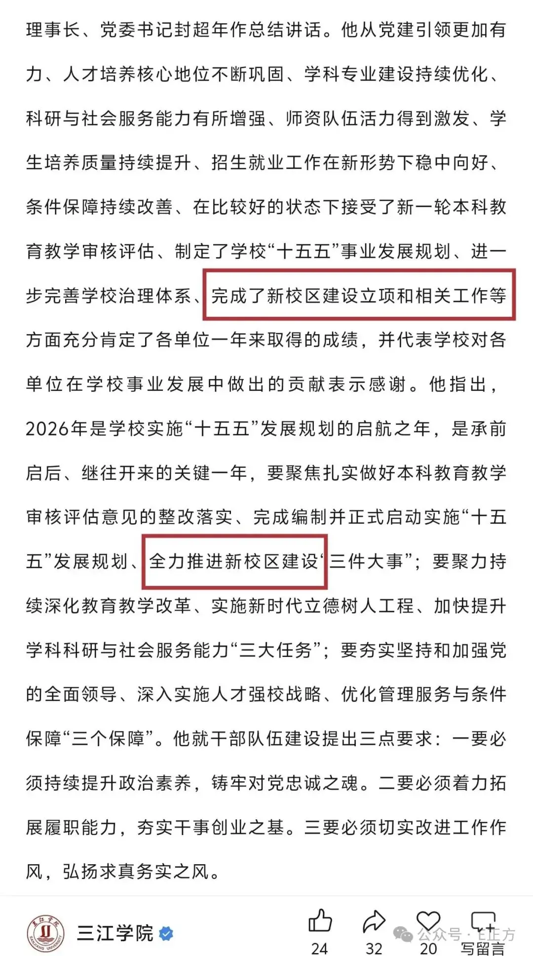 在三江学院2025年度工作述职大会中,理事长、党委书记封超年作总结讲话,其中关于三江学院新校区提及两点。一是2025年学校完成了新校区建设立项和相关工作;二是2026年“全力推进新校区建设”列为学校三件大事之一。可见从学校方面的表态来看,2026年也将是全力推进新校区建设和未来搬迁的一年!根据规划,三江学院新校区规划总建筑面积约62万m²(其中规划建筑面积为571780m²,防空地下室建筑面积约47211m²),承载学生规模为22000人。