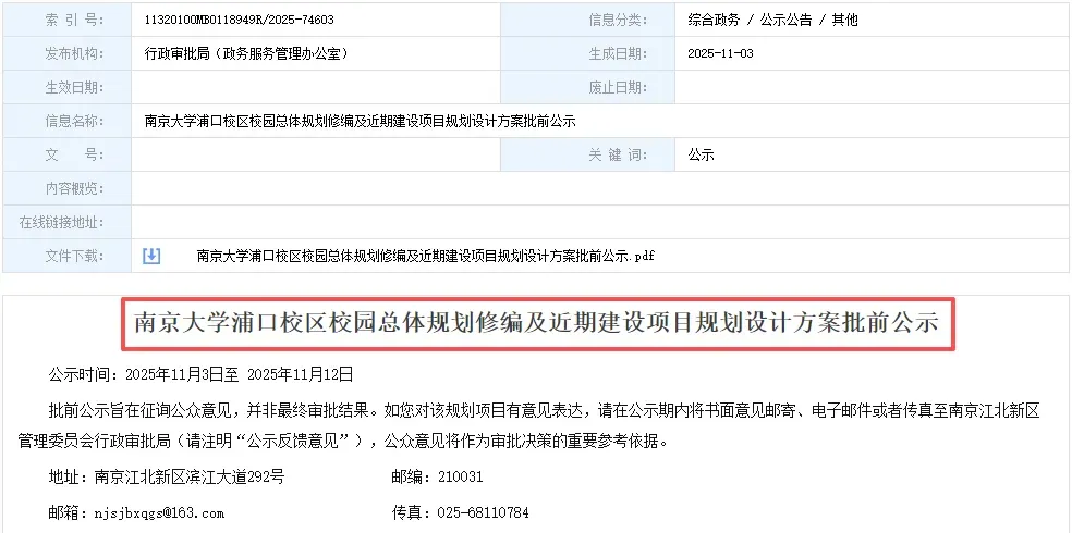 去年11月3日,江北新区官网显示,“南京大学浦口校区校园总体规划修编及近期建设项目规划设计方案批前公示”正式发布。根据规划内容,南京大学浦口校区将进行部分拆除和新建,建成后校园总面积将达到约90.3万㎡!