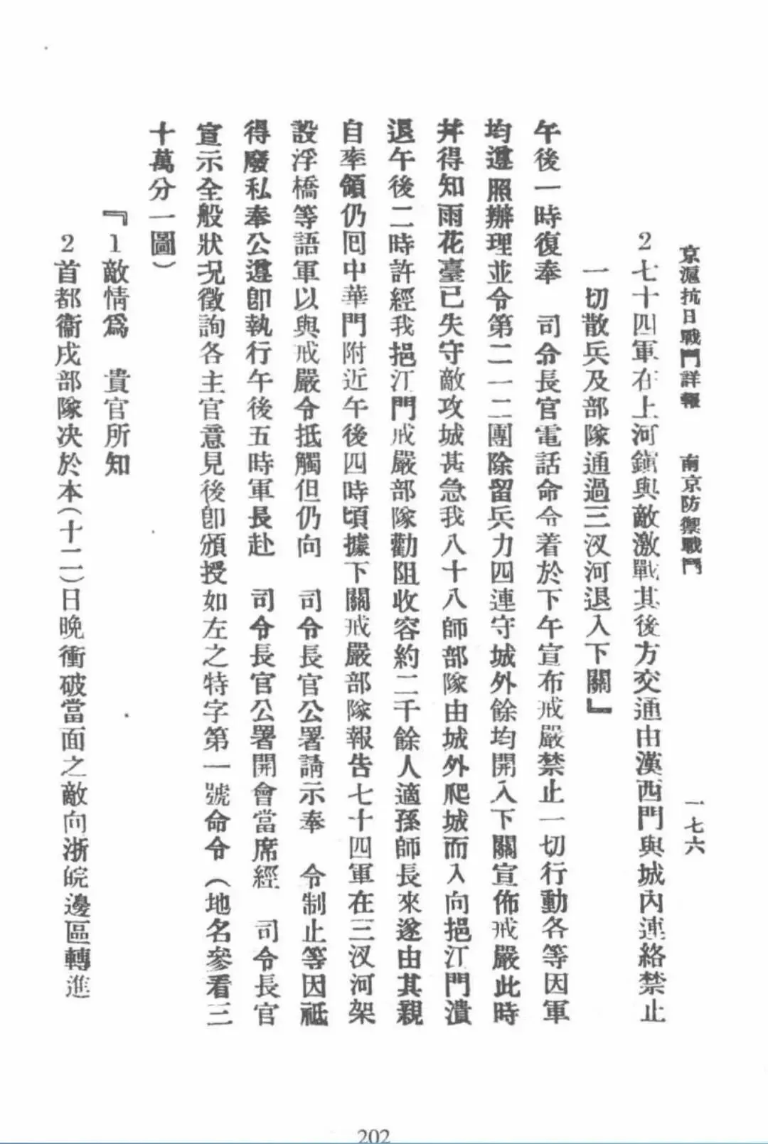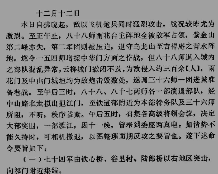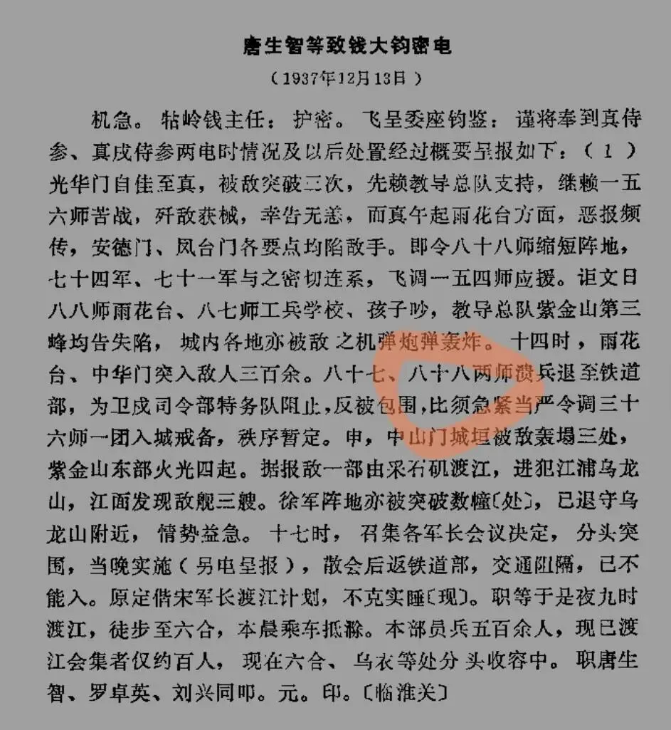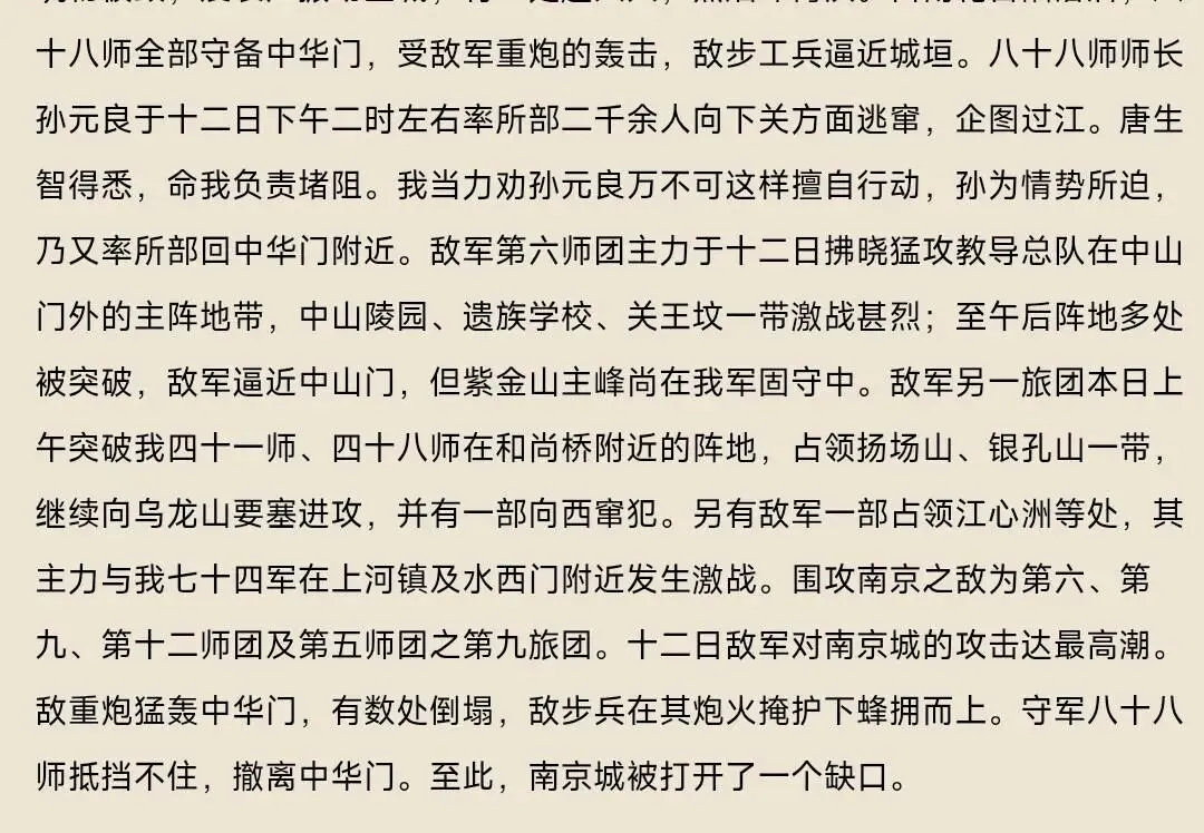 在后面的《南京保卫战战斗详报》中,唐称:至午后三时,八十八、八十七两各一部溃退部队,经中山路北走拟出挹江门,至铁道部附近为本部特务队及三十六师所阻,不听,秩序益紊: