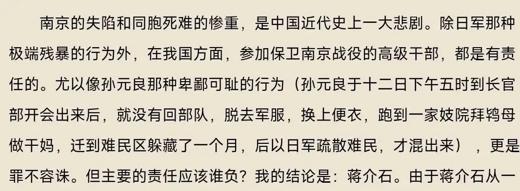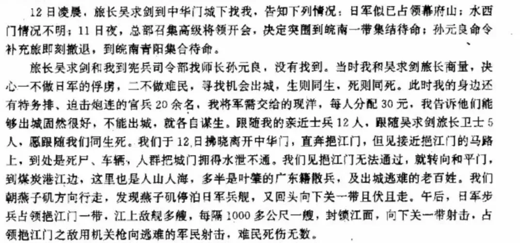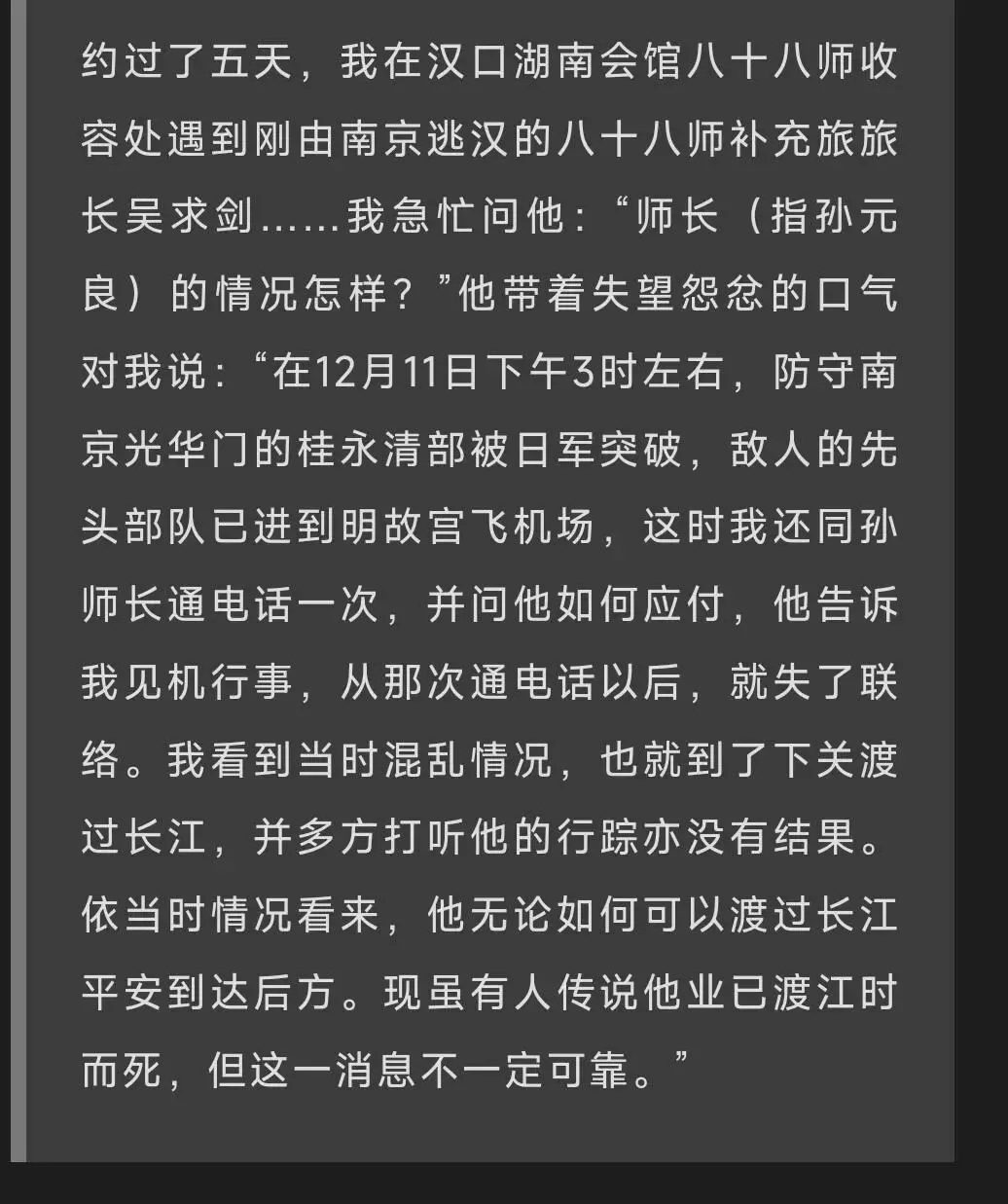 由此可见,葛天所说的孙元良11日与补充旅断联纯属造谣,笔者十分好奇,明明补充旅旅长、参谋主任均著有回忆文章,且二人一致说孙元良在唐生智下撤退令当晚仍与䃼充旅保持联络,也把撤退令传达给了补充旅,为何某研究院作者要在这种情况下,引用一个非补充旅军官转述的吴求剑言论?尤其是此人所说的吴之言论,与吴本人的回忆文章完全对不上: