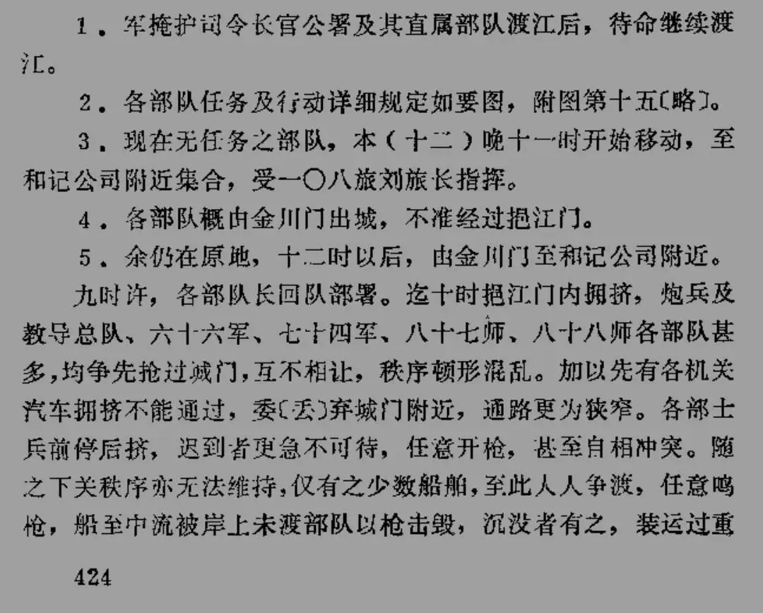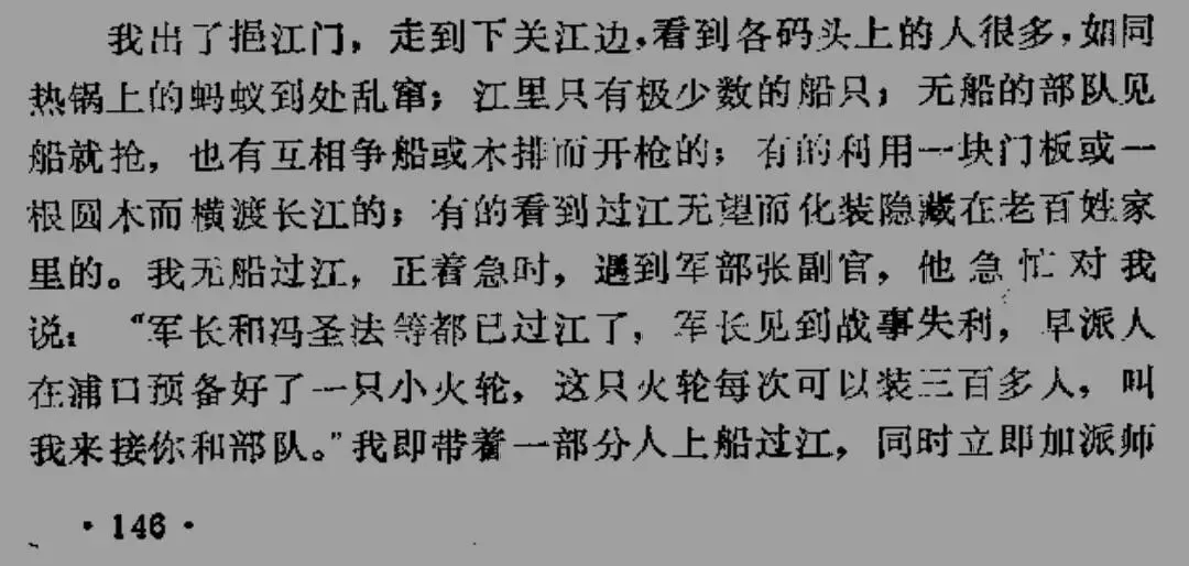 “我率司令部人员及直属队于是晚十二时到达和记公司附近,觅得气艇,两艘民船十五只,即开始渡江。第一次渡江后,派人将船押回江南续运”