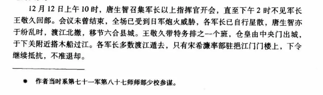 71军方面,据该军87师副师长兼261旅旅长陈颐鼎回忆,他们在12日下午3:00便和军长王敬久失联(这时孙元良正在中华门前线督战),后来得知,王敬久和87师师长沈发藻均在12日下午过江(大概率是唐生智刚下令撤退,这俩哥们就跑了):