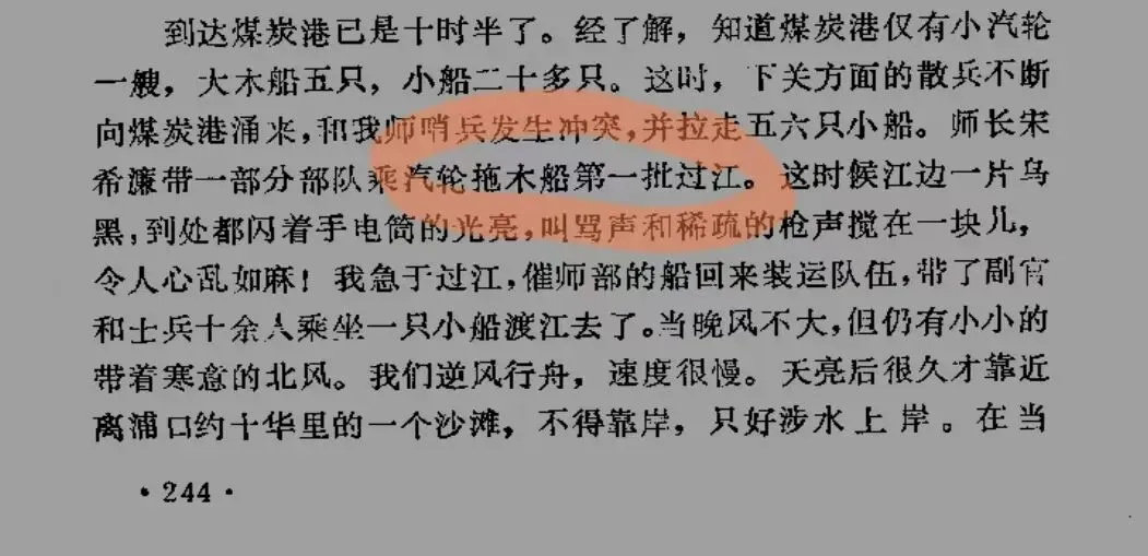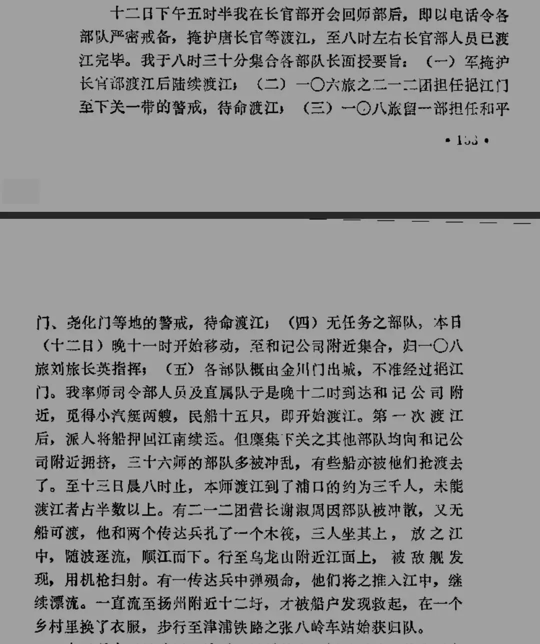 看来宋长官确实是36师最早渡江者之一,对于渡江后的行踪,宋说的很含糊,先说撤军的客观困难,再花大量笔墨描写手下一营长的脱险经历,既不说自己的行踪,也避谈在江北收容官兵的问题。