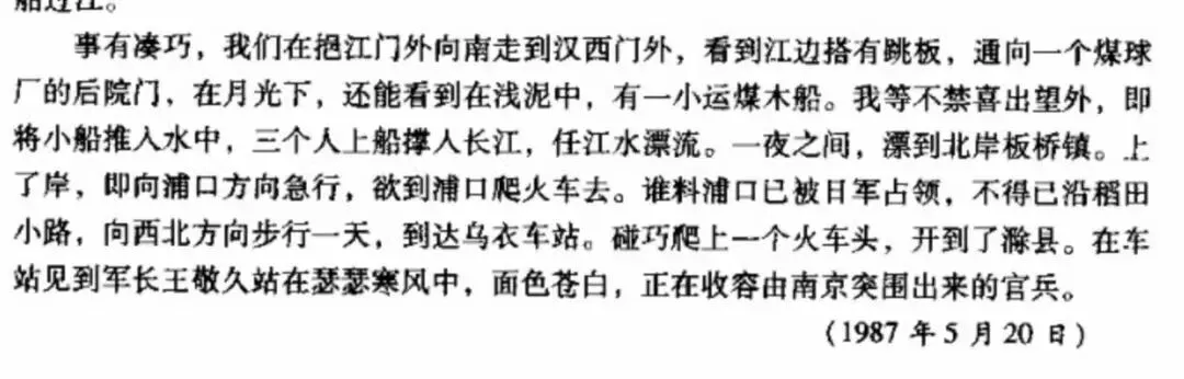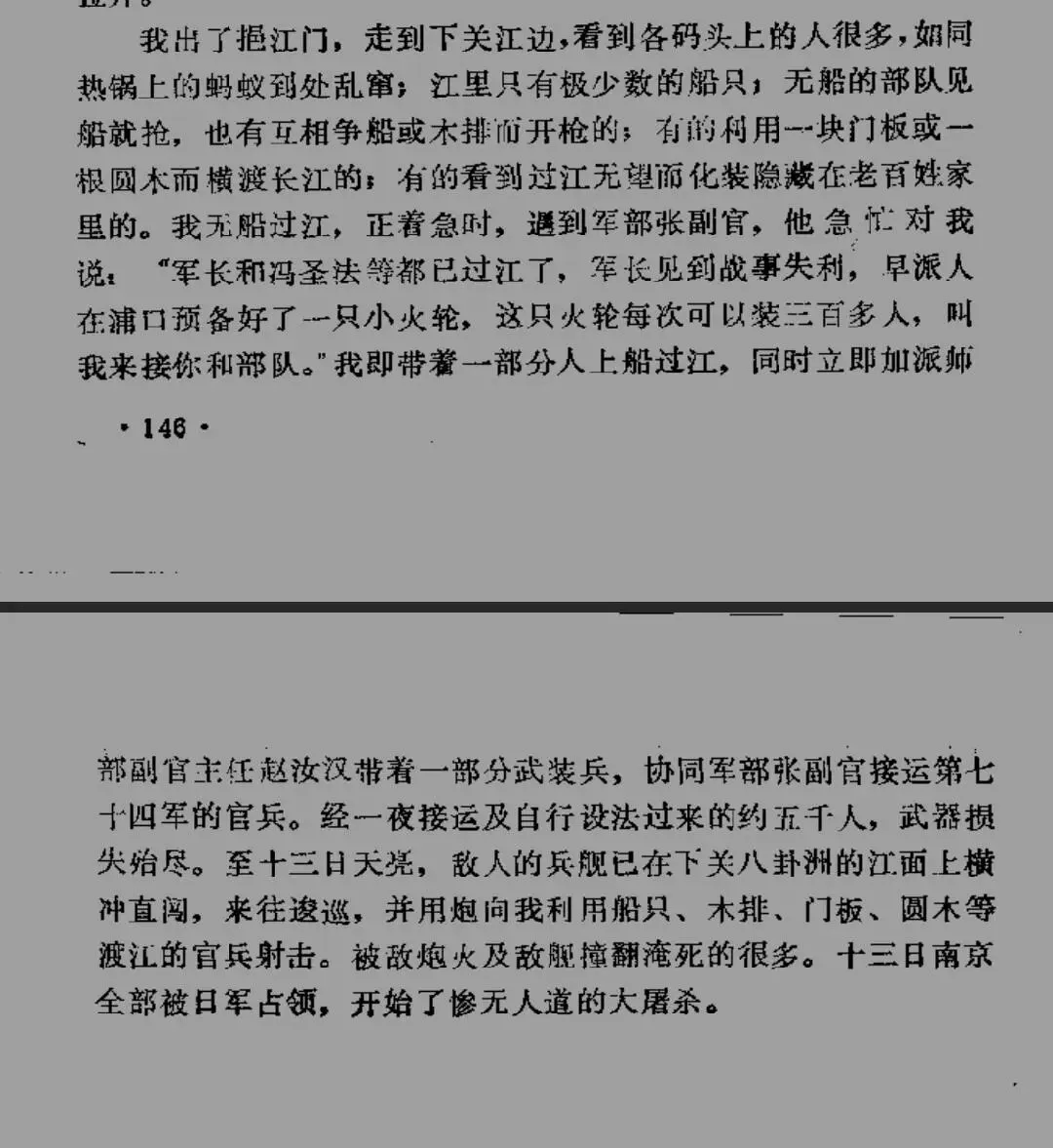 下面我们再看别的部队,先说著名的74军,据时任51师师长的王耀武回忆,该军军长俞济时大概是在12日下午5:00唐生智下令撤退后-天黑前这个时间段乘船过江: