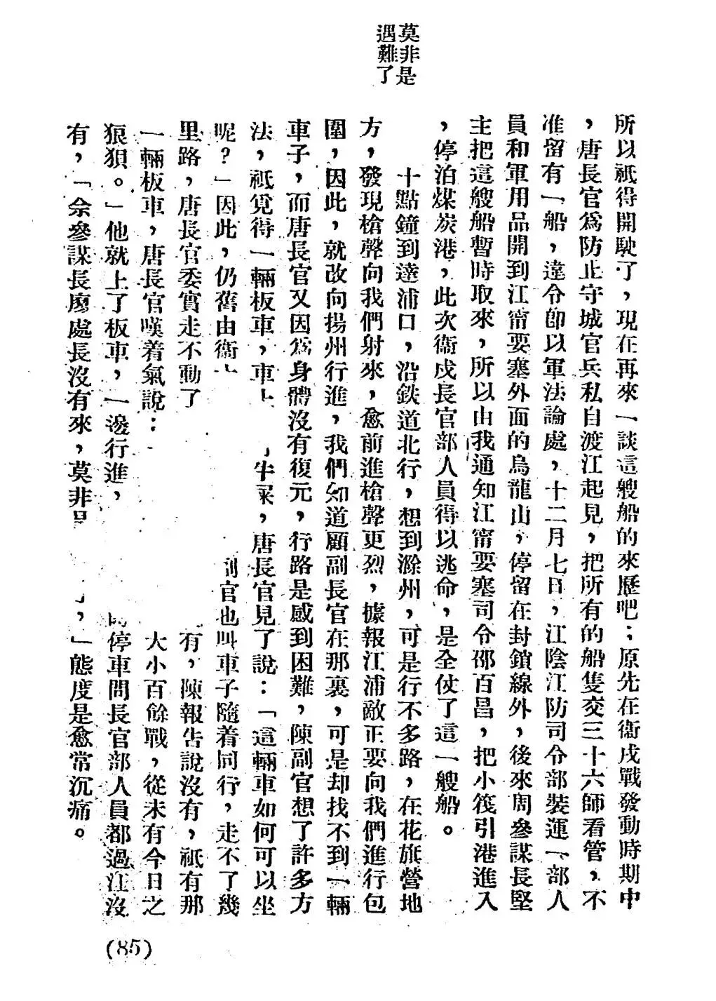 那么,唐生智是乘坐36师手上的“合规”船只撤离的吗?据谭道平记载,唐乘坐的是江阴江防司令部的货运船,这艘船是卫戍司令部参谋长周斓坚持留下的:
