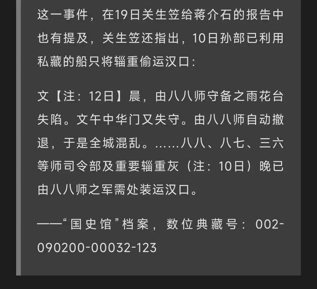 这位作者认为,88师用船疏散本部、36师(画重点)、87师辎重至汉口是孙元良提前规划逃跑,那么,这里面涉及的好像不止孙元良部的辎重吧?孙部后运辎重是逃跑,那宋希濂拜托孙元良帮他运辎重,算什么呢?