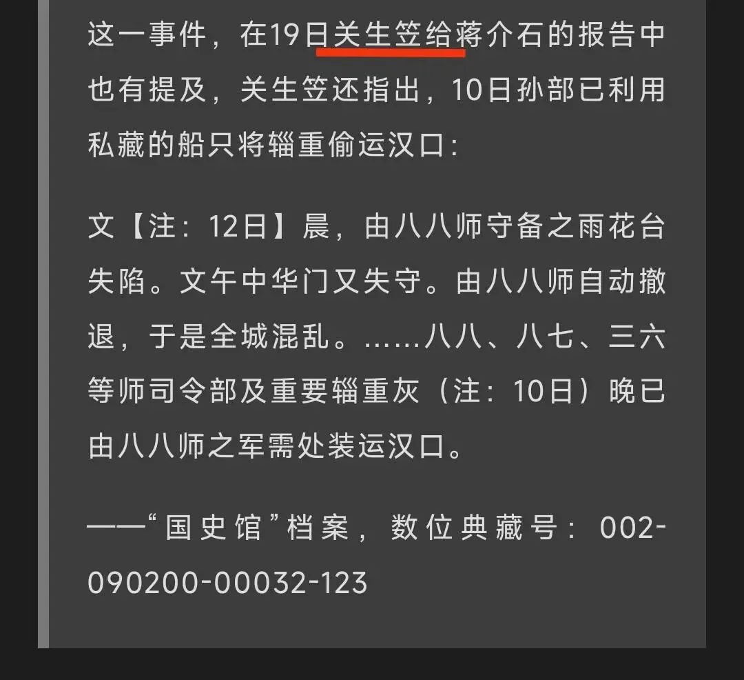 像上图这篇“大作”,引用档案指责孙部私藏船只,提前往后方运送辎重,这份档案正是我前文引用过的戴笠电报,想必作者一定是碰巧“看漏”了其中报告孙在一线督战的文字。