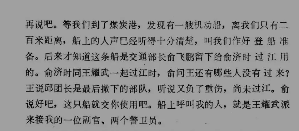 俞济时和58师师长冯圣法在唐生智撤退会议散会后没多久,便乘此船过江,俞过江后派此船回浦口运载74军官兵,王说一夜间运了5000人左右(和俞报的74军收容人数对不上,可能算了别的部队的人),其中包括王耀武和邱维达。