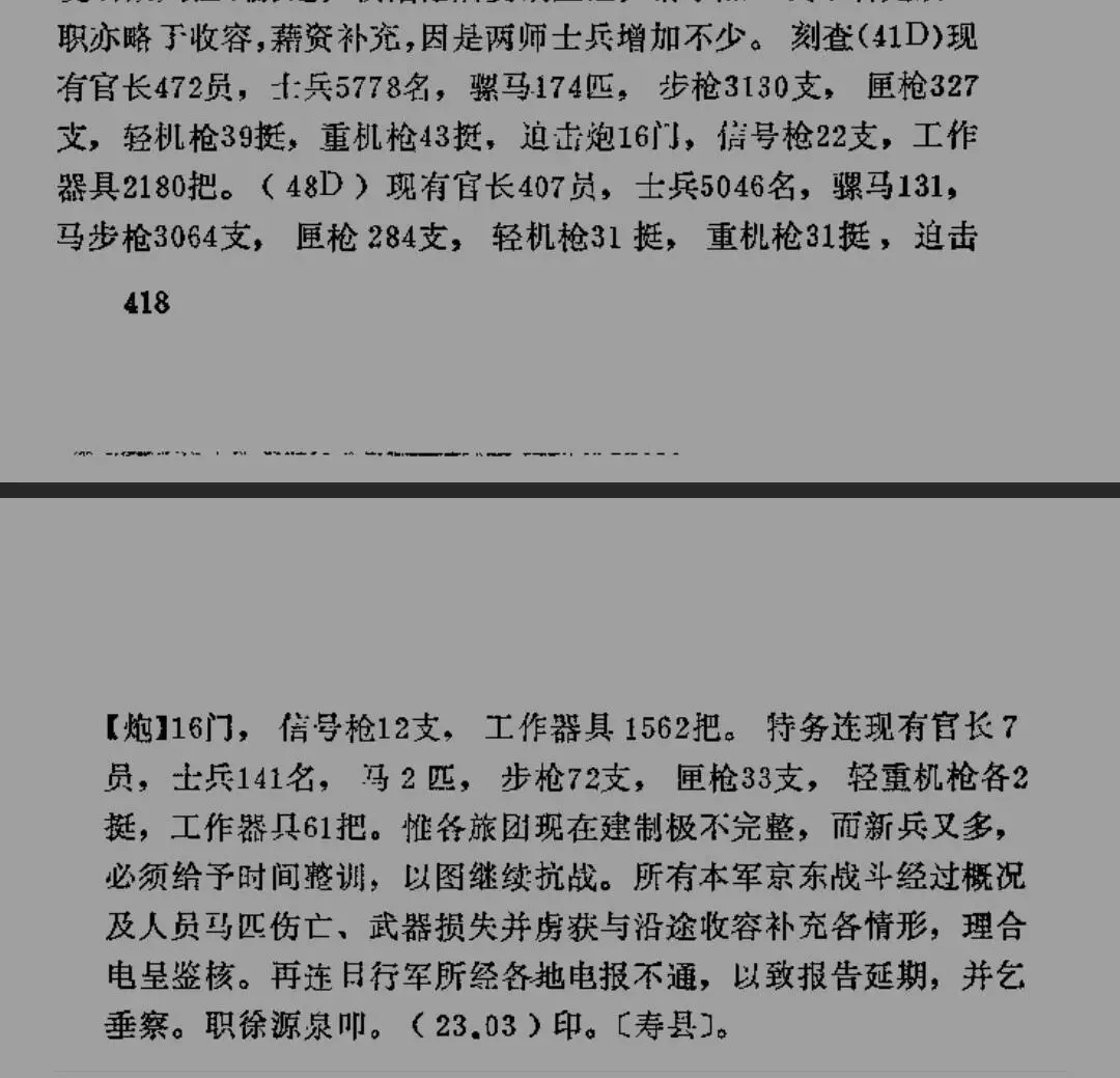 徐源泉部是南京战役国军各部中突围后建制最完整的,他事后向蒋介石报告,41师剩余6100余人,48师剩余5400余人,特务连剩余148人,他这一个师可抵俞济时一个军了...
