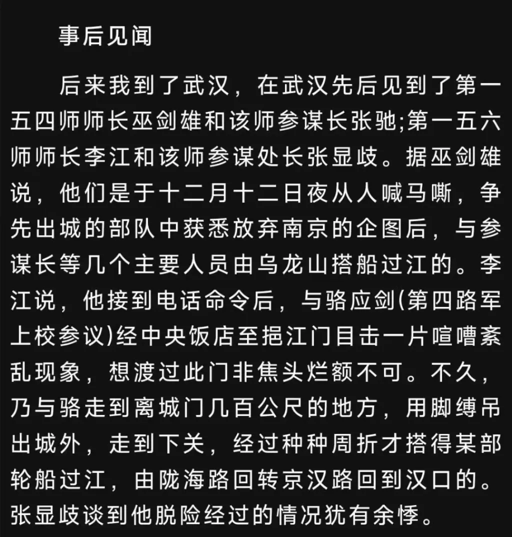 在传统印象中,只有粤军执行了唐生智的突围令,这不错,但这两军四个师中,有三个师的师长都是乘船跑路的,至于他们坐的船是事先本部私藏的,还是友军的,那就只有他们自己知道了,至少从刘绍武的文字来看,谭邃坐的很可能是66军的私藏船只。
