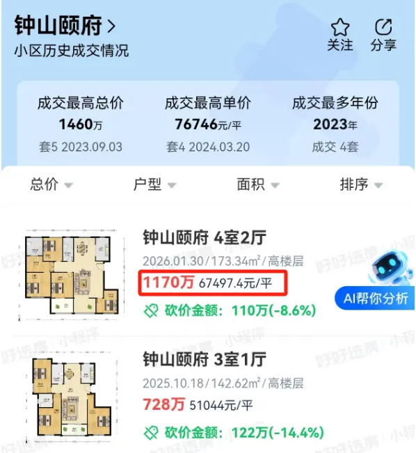 根据某二手房平台展示的成交纪录,2026年以来,该平台已有9套千万级豪宅成交。除了钟山颐府之外,还有: