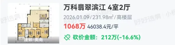 河西南的万科翡翠滨江,刚刚成交1套建面约231.98㎡4室2厅房源,总价1068万,成交周期仅63天。