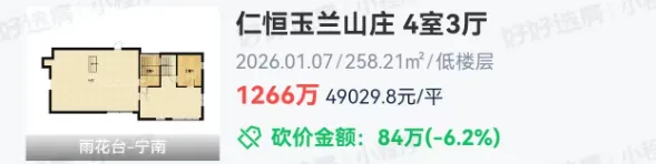雨花宁南的仁恒玉兰山庄,刚刚成交1套建面约258.21㎡房源,总价1266万,成交单价约4.9万/㎡。