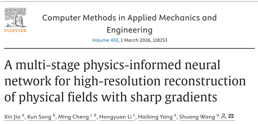 研究成果以“A multi-stage physics-informed neural network for high-resolution reconstruction of physical fields with sharp gradients”为题发表于期刊Computer Methods in Applied Mechanics and Engineering。本文第一作者是南京工业大学Xin Jia。