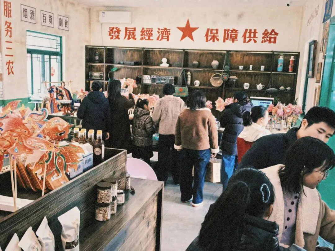 村口,车流如织,井然有序;村内,人潮涌动,笑语欢声。要说村里最具人气的“打卡点”,非那间充满复古风情的供销社莫属。搪瓷杯、老布鞋、印着大红喜字的大茶缸……这些带着岁月痕迹的老物件,不仅勾起了中老年游客的青春记忆,也成了年轻人口中的“硬核潮品”。大家或驻足端详,或挑选几样特色农产品带回家,小小的空间里挤满了寻找旧时光的人。而在供销社院内,跳格子的粉笔线画了一道又一道,孩子们蹦跳的身影和家长的加油声,让这块小小的空地成了最热闹的“竞技场”。