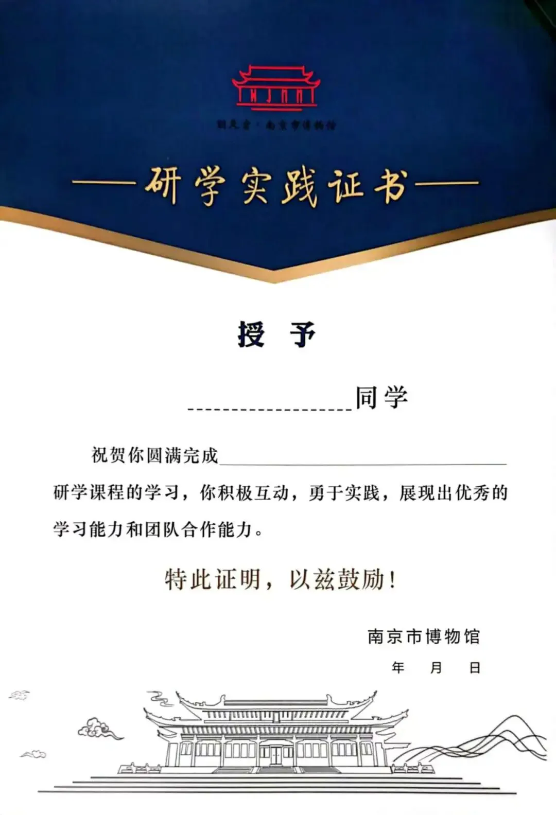 收获双重证书,南京市博物馆结营证书,志愿者服务证书(同步我的南京2小时)
