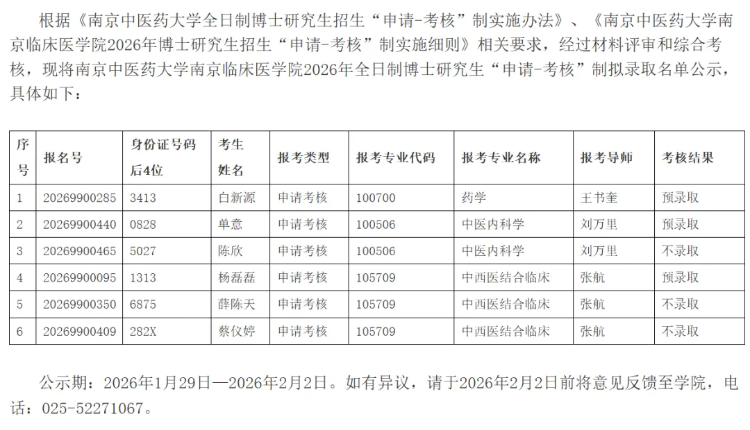 >南京中医药大学南京临床医学院2026年申请考核制博士招生拟录取人员名单公示