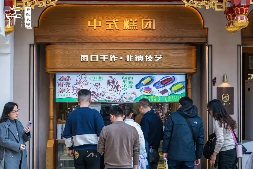 在夫子庙贡院西街,有着76年历史的中华老字号莲湖糕团店门前早已排起长队,甜糯的香气隔着老远就抓住了游人的脚步。