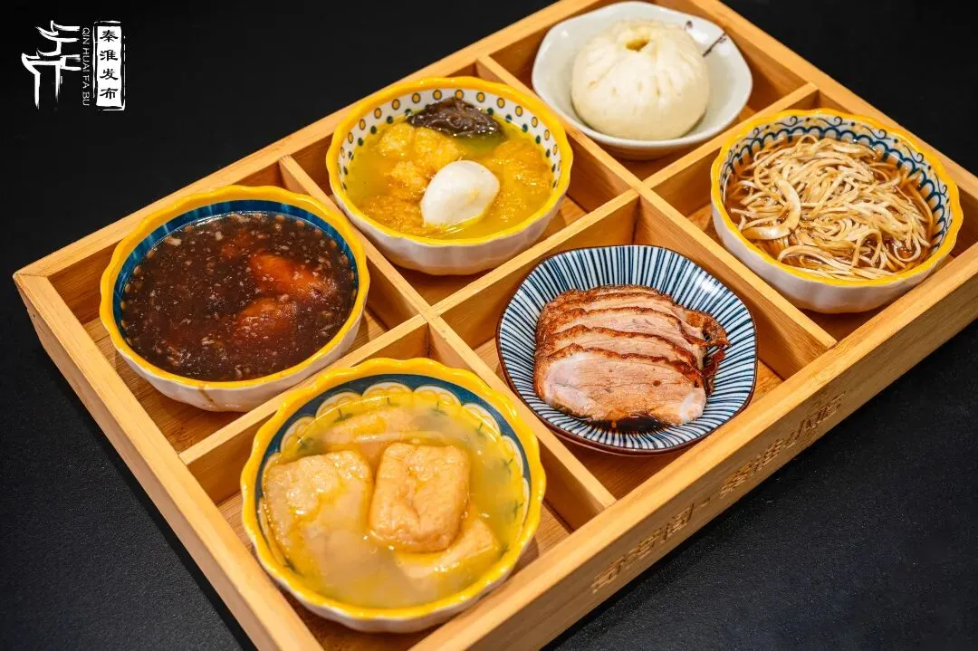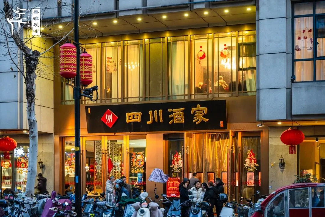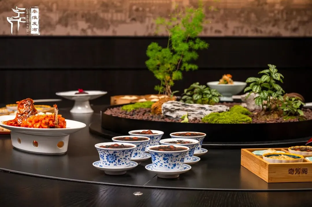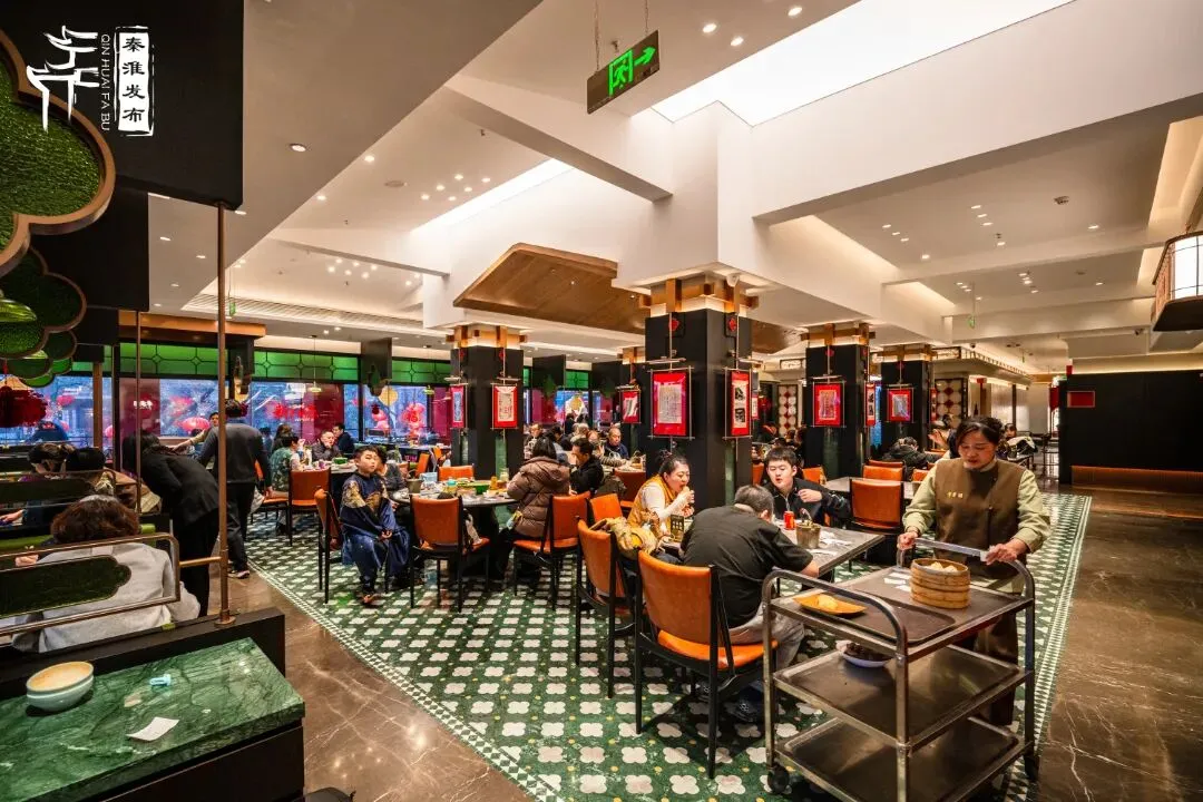 春节期间,改造升级后的门店与夫子庙新春氛围完美相融,在保留明清建筑风貌的基础上,内部巧妙融入剪纸、皮影、千里江山图等国风元素,通过落地窗将秦淮河景致引入室内,打造出兼具历史感与现代美学的用餐空间;店内还创新性引入国风舞蹈、古筝竹笛等演艺表演,让食客在品尝美食的同时,沉浸式感受秦淮风雅。