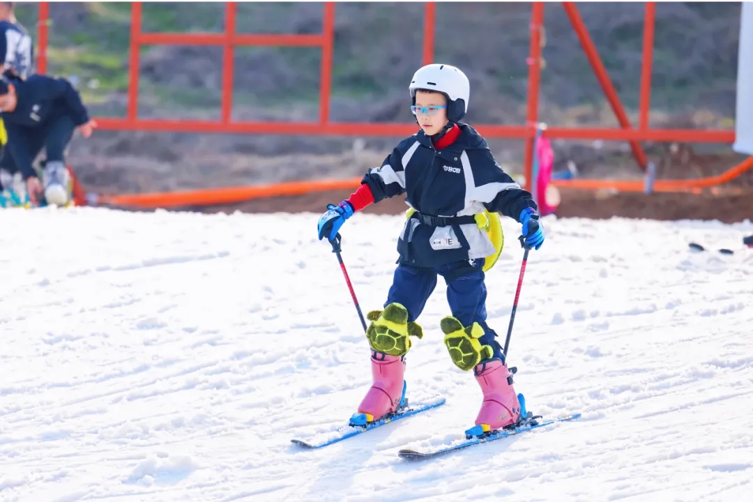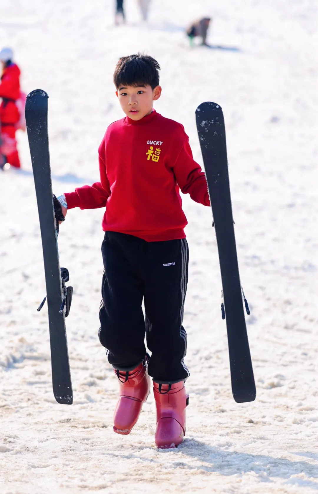 滑雪道上,少年拎起滑板