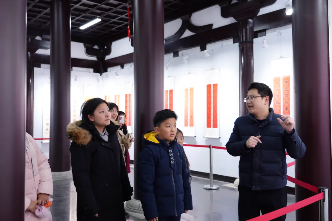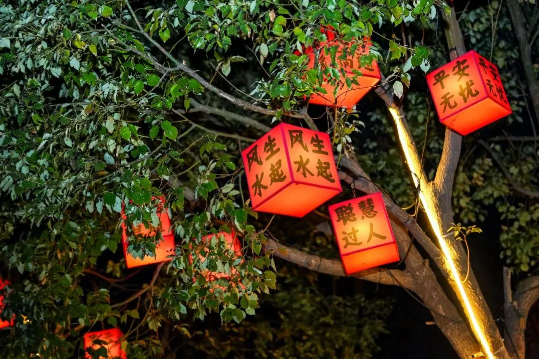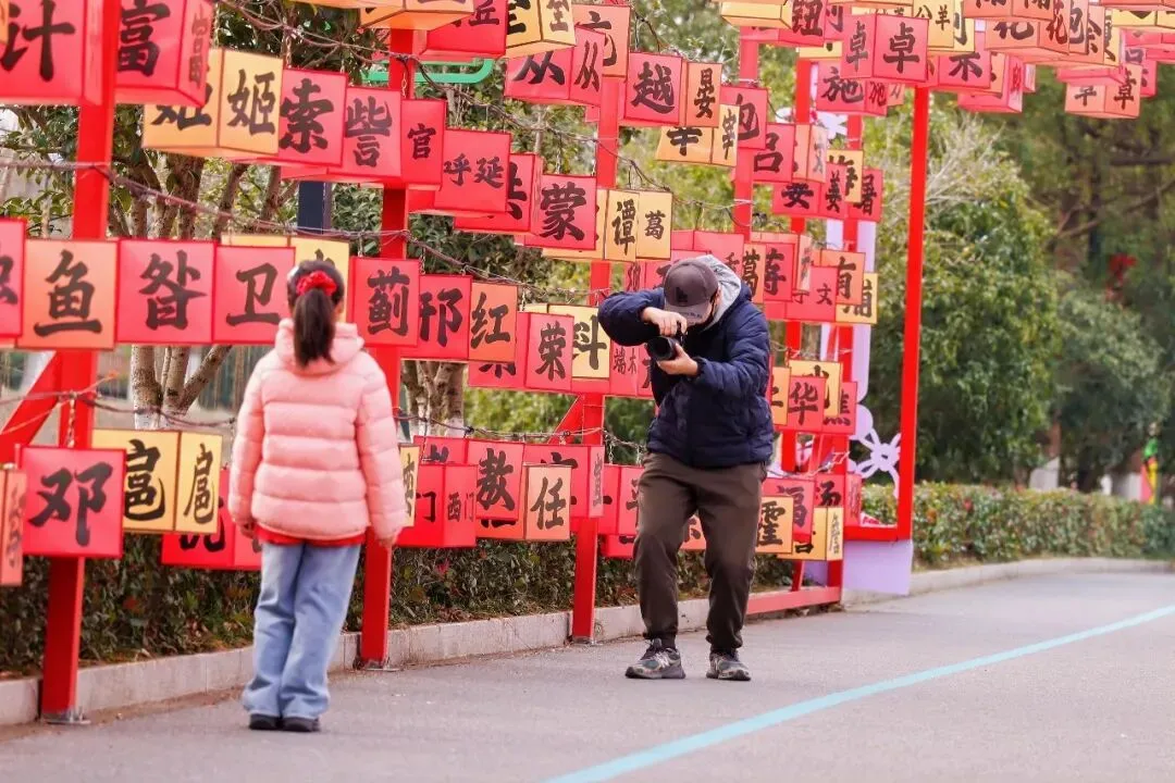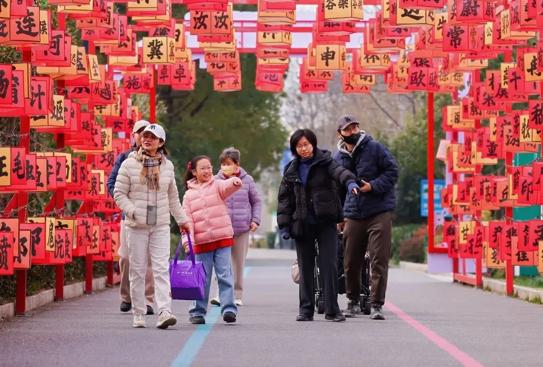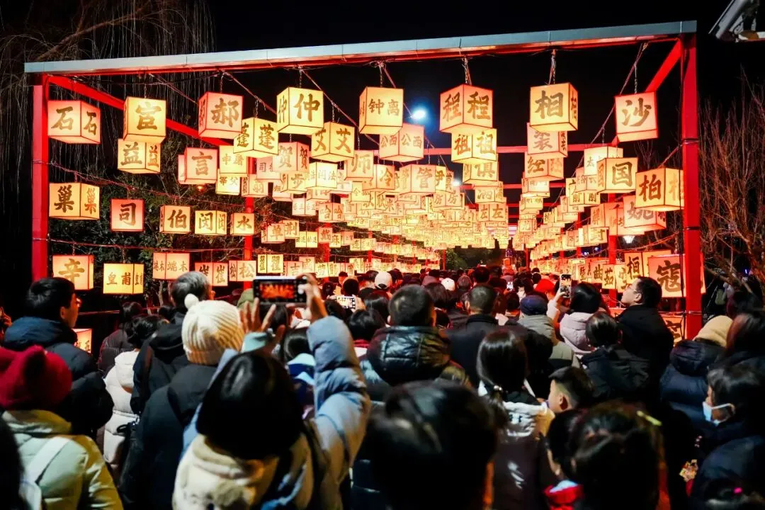 他们仰头端详着传统花灯上的新年祝福