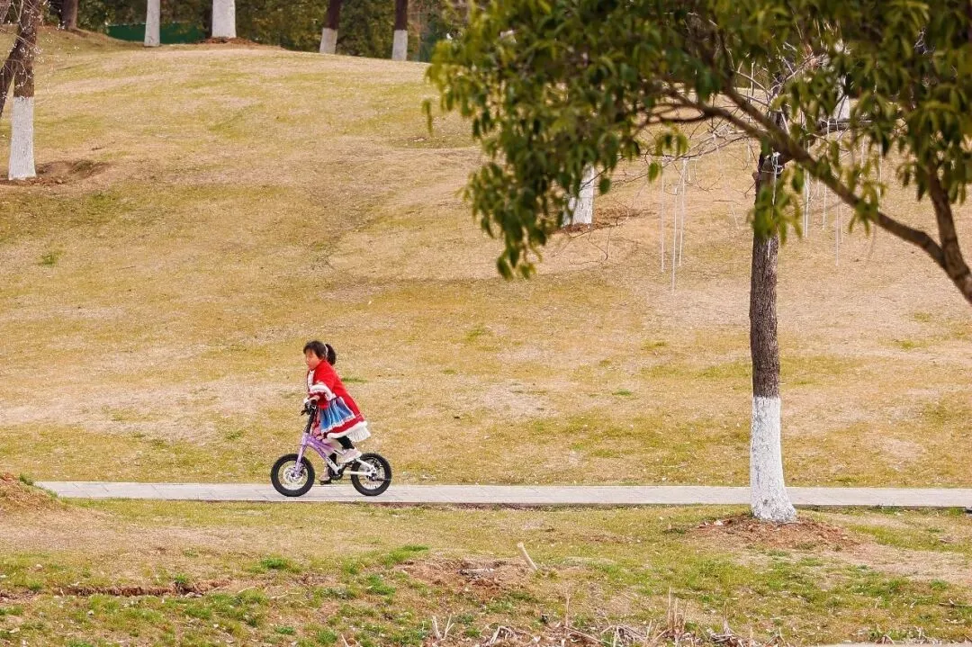 小朋友蹬着自行车飞驰向前