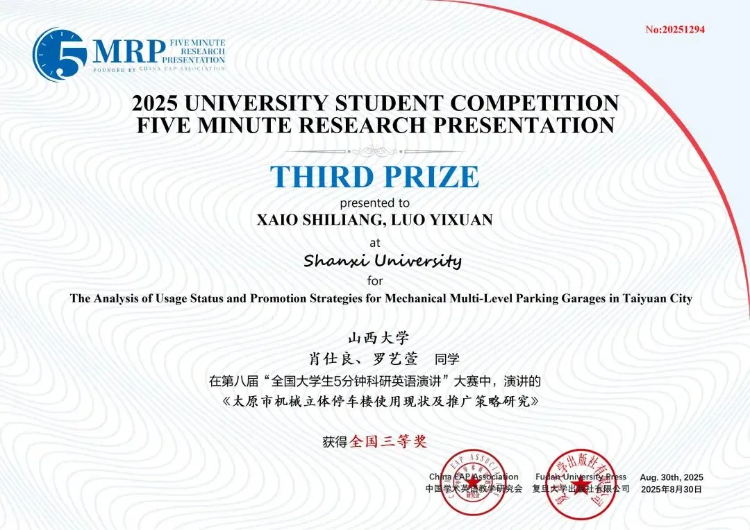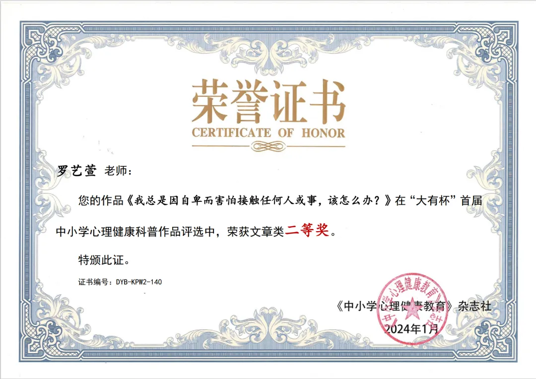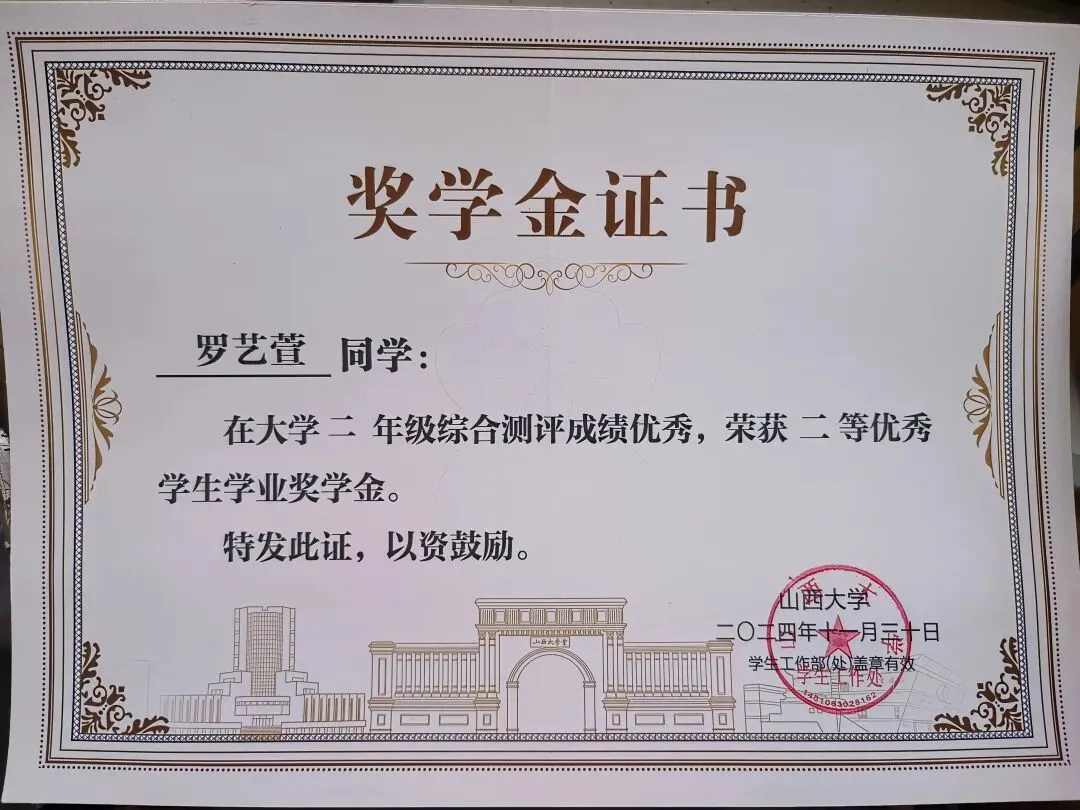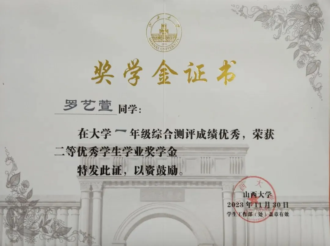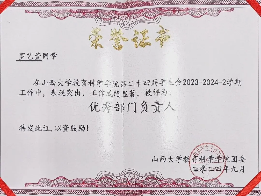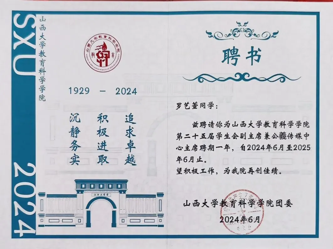 本科就读期间,罗艺萱同学曾担任教育科学学院学生会副主席兼公義传媒中心主席并获得“优秀部门负责人”称号。此外,罗艺萱同学也获得了连续三年山西大学二等优秀学生学业奖学金;参加大学生创新创业训练项目,合作发表文章至《心理学进展》2025年9月15卷9期;获得“大有杯”首届中小学心理健康科普作品评选全国二等奖;获得第八届“全国大学生5分钟科研英语演讲”大赛全国三等奖等多项荣誉。