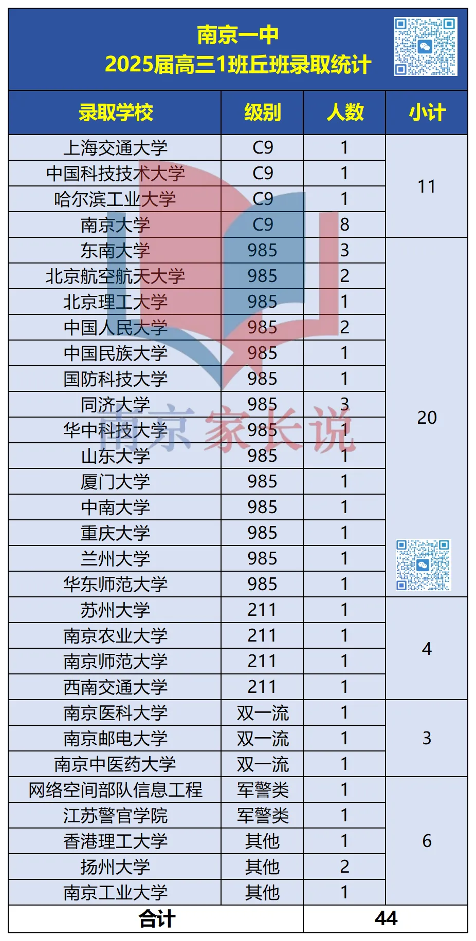 2022年,南京外国语学校和南京第一中学率先落地首届丘成桐少年班(即“丘班”),2025年首届丘班已经毕业,先一起来看看成绩如何。南外首届丘班共54位学子,14人通过竞赛类保送、提前录取;13人走语言类保送,出国留学11人,16人凭优异的高考成绩上岸985/211大学。首届丘班成绩全面开花,也体现了南外多元化的发展。2025年南京一中丘班毕业时全班总共44人,从录取去向来看没有清北,但是头部985还是不少,用“高性价比”证明实力。C9高校录取共11人:上交1人、中科大1人、哈工大1人、南大8人,占比25%;